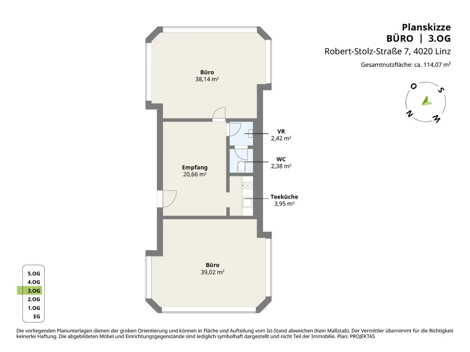 Raumaufteilung: laut Planskizze, Empfang, 2 Büroräume, Teeküche, WC
