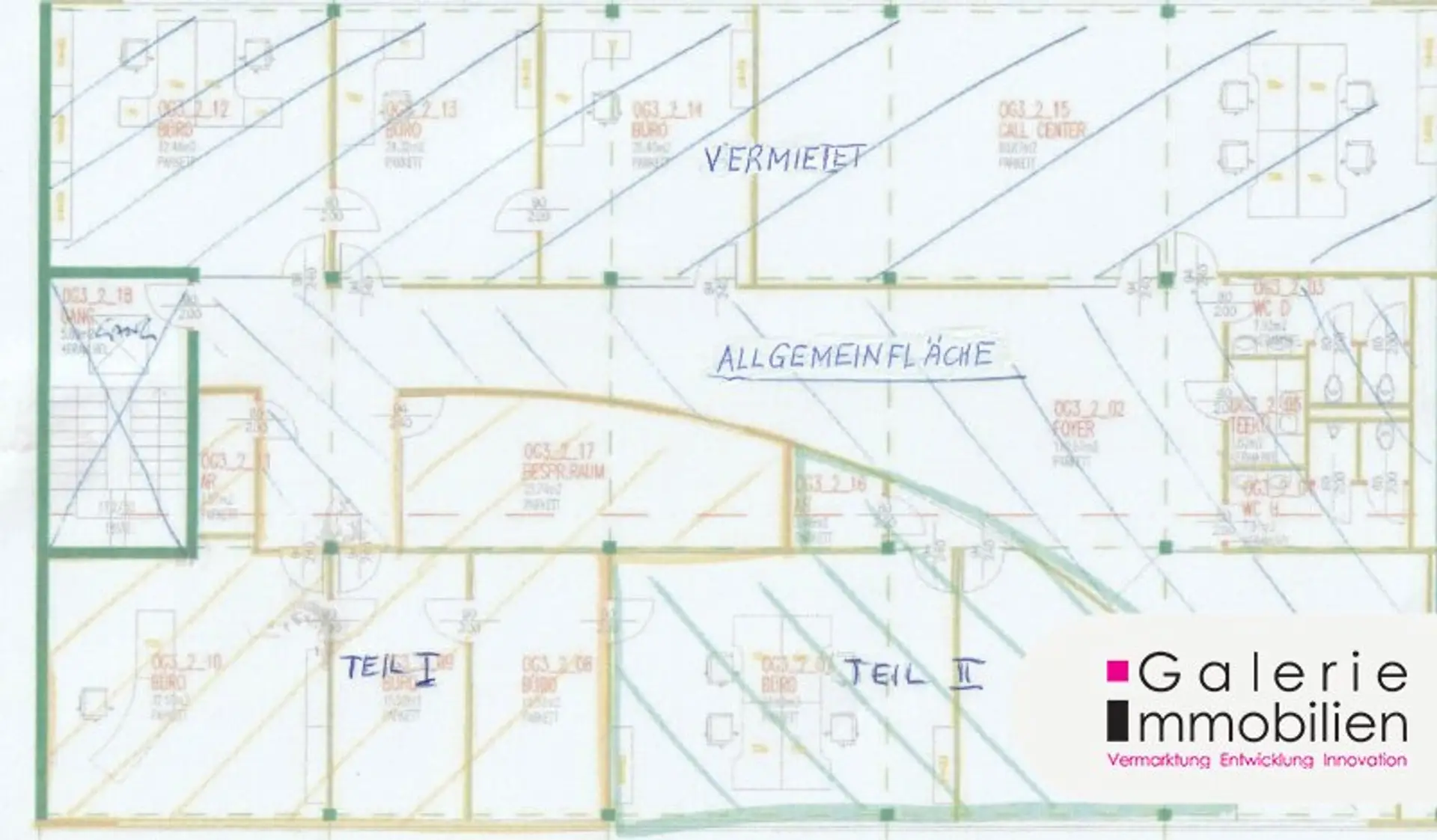 In einem modern und innovativ gestalteten Bürohaus gelangen 2 Räume mit 39,60m² und 24,60m² in der 3. Etage zur Vermietung. Die hellen Räumlichkeiten werden vorerst bis 2032 befristet vermietet, eine Verlängerung ist möglich. Durch die Raumhöhe von 2,80m und die zahlreichen Glas- bzw. Fensterfronten wird eine angenehme Arbeitsatmosphäre geschaffen.