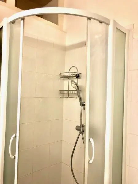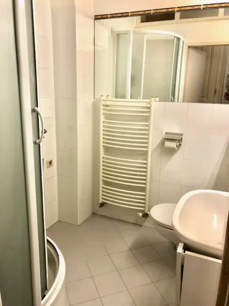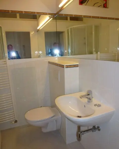 * Bad mit großzügige Eck-Dusche, Handwaschtisch mit Wand-Spiegel, WC, Waschmaschinen-Anschluss, Heizungshandtuchhalter;