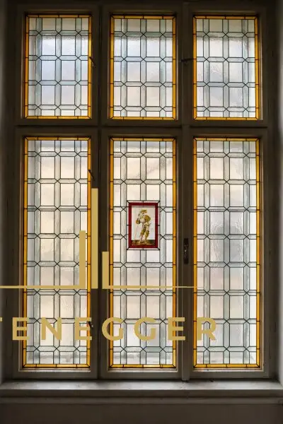 Besonders eindrucksvoll ist der westseitige Haupteingang mit vorgelagertem Stiegenhaus, ergänzt durch eine Sandsteinplastik des Heiligen Florian, des Schutzpatrons vor Feuer – ein seltenes und charmantes historisches Detail, das dem Haus zusätzliche Identität verleiht.