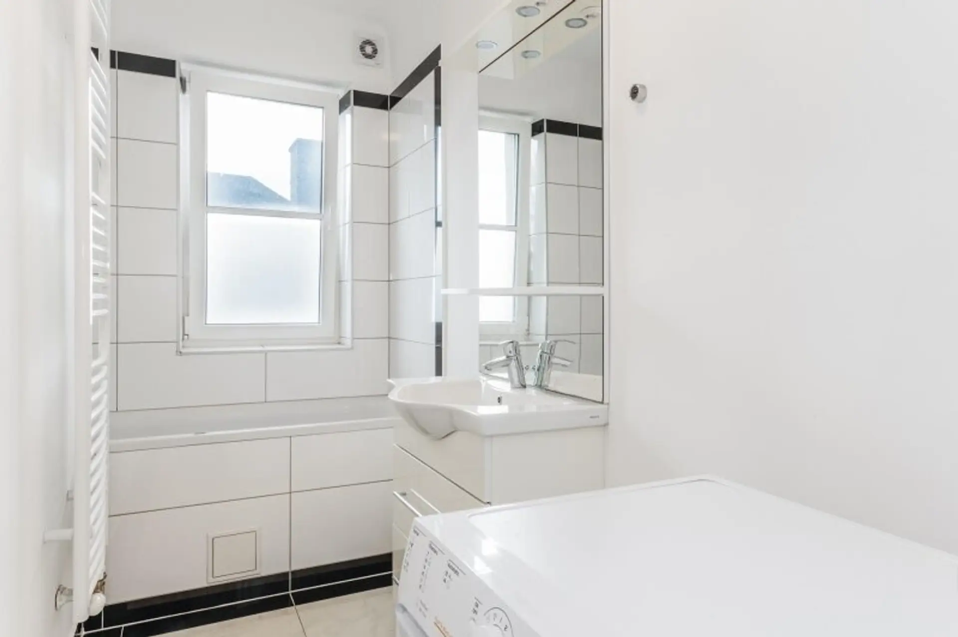 Das Highlight der Wohnung ist die lichtdurchflutete Wohnküche. Die Fenster blicken nach Norden in die verkehrsberuhigte und begrünte Wlassakstraße sowie nach Osten über die Dächer des 13. Bezirks. Die Küche ist mit einem Backofen, einem Kühlschrank mit Gefrierfach und einem Dunstabzug ausgestattet. Das Badezimmer verfügt über eine Badewanne, ein Waschbecken, einen Waschmaschinenanschluss, der Toilette sowie ein Fenster. Die Beheizung und Warmwasseraufbereitung erfolgt über eine Gasetagenheizung.