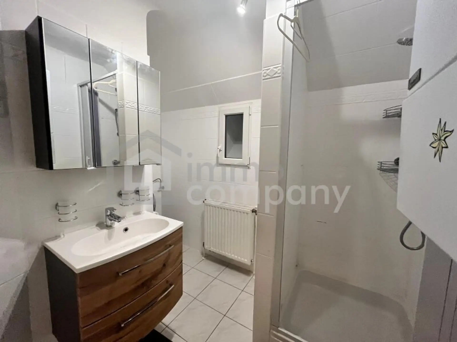 Badezimmer mit Fenster, Dusche, Waschmaschinenanschluss und WC
