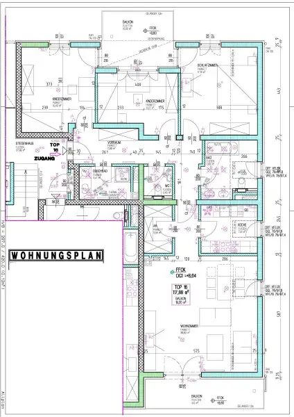 Im 3. Obergeschoss mit Lift gelegen, stehen ein Vorraum, 3 Zimmer, ein sonniges und großzügiges Wohn/Esszimmer mit Ausgang auf die ca. 10m² große Süd-Terrasse zur Verfügung, eine ca. 9m² große Nord-Terrasse, die von 2 Zimmer aus zu betreten ist, ein Bad mit Wanne und WC, ein Bad mit Dusche, ein separates WC und ein Abstellraum zur Verfügung.