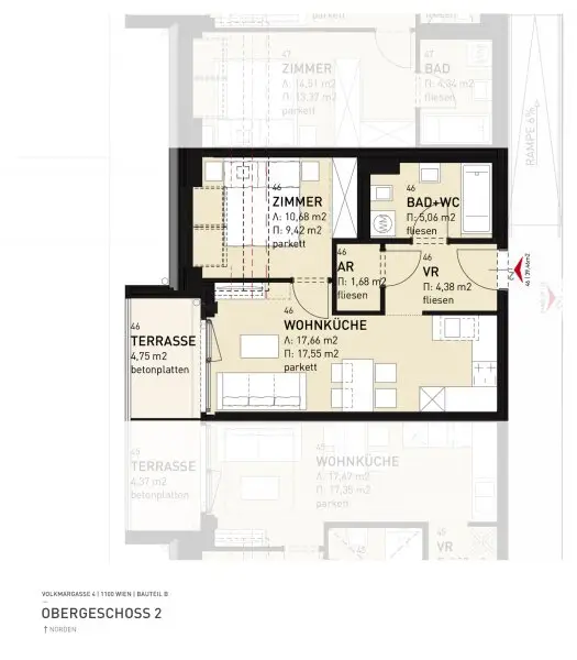 Wichtige Einrichtungen des täglichen Bedarfs befinden sich in unmittelbarer Nähe bzw. können aufgrund der optimalen Anbindung an das öffentliche Verkehrsnetz – nur 600m bis zur U1 Station Neulaa – schnell erreicht werden.