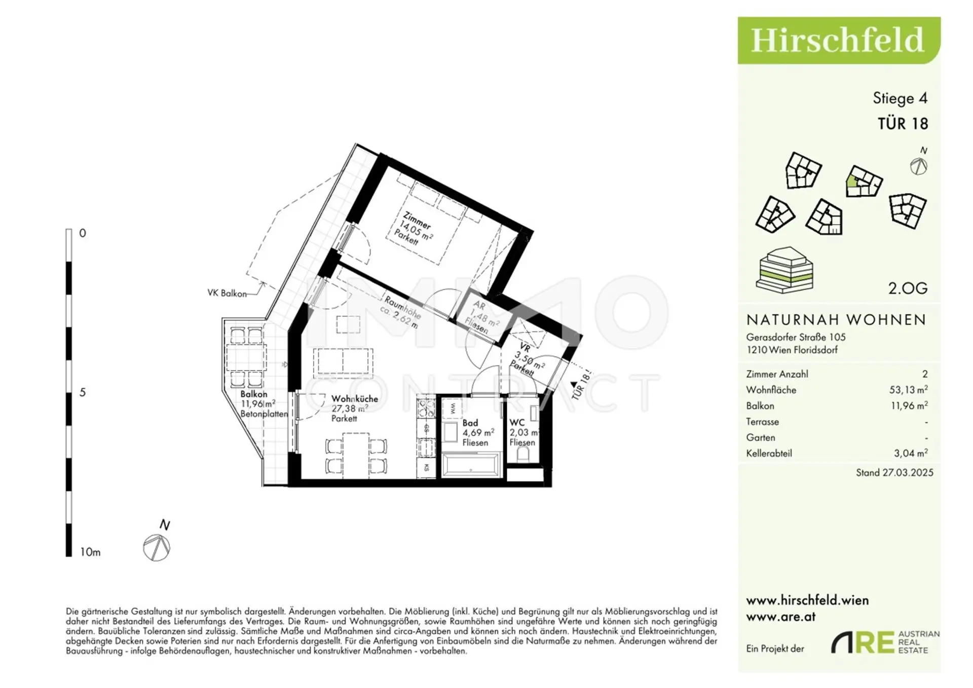 Hirschfeld ist ein beschauliches Viertel am Wiener Stadtrand. Die Metropole im Rücken verheißt jedem Nachhausekommen ein Naturerlebnis und Entspannung. Wer gerne mit den Wiener Linien unterwegs ist, nimmt am besten die Autobuslinie 32A ab Kollarzgasse bis zum U- und S-Bahn-Knotenpunkt Leopoldau. Von hier aus ermöglichen die U1 in Richtung Zentrum sowie die Schnellbahnlinien S1, S2 und S7 eine rasche Verbindung stadtein- und stadtauswärts. Alternativ verläuft die Straßenbahnlinie 31 entlang der Brünner Straße über Floridsdorf direkt bis Schottenring. Autofahrer profitieren von der nahegelegenen A22.