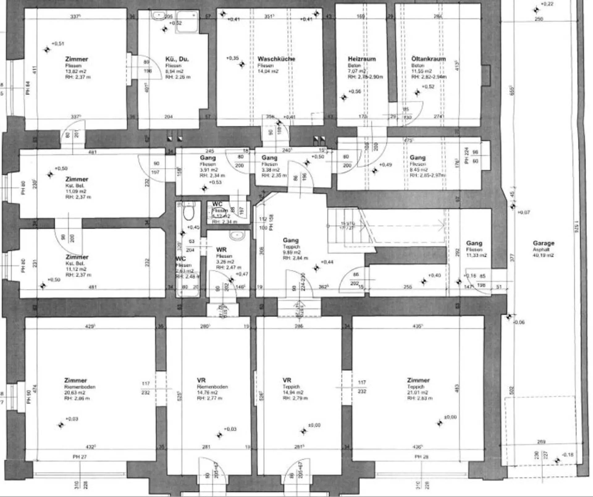 Der grüne Vorgarten führt Sie zum ebenerdig begehbaren Erdgeschoss. Die beiden Eingangstüren führen Sie in jeweils eine der drei Wohneinheiten, die sich in dem Geschoss befinden. Beide verfügen über einen großflächigen Vorraum und einen großen Wohnraum. Die linke Wohneinheit führt Sie über den Vorraum zum Badezimmer und zur Toilette. Die dritte Wohneinheit verfügt über ca. 50 m² und ist über einen Gang erreichbar. Drei Zimmer, eine Küche mit Dusche und eine separate Toilette befinden sich in dieser Einheit. Ebenfalls finden Sie in dem Geschoss die Waschküche, den Heizraum den Öltankraum sowie Zugang zur Garage. Über eine Treppe gelangen Sie in das 1. Obergeschoss.