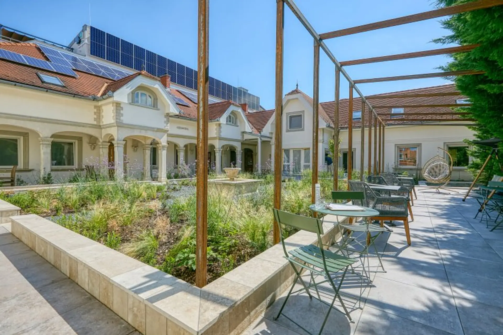 Artrium-Innenhof: Die Immobilie umschließt einen wunderschönen, neu gestalteten Innenhof, der im Jahr 2025 realisiert wurde. Die moderne Bepflanzung, ein Springbrunnen sowie reichlich Sitzmöglichkeiten bieten Bereich für Entspannung.