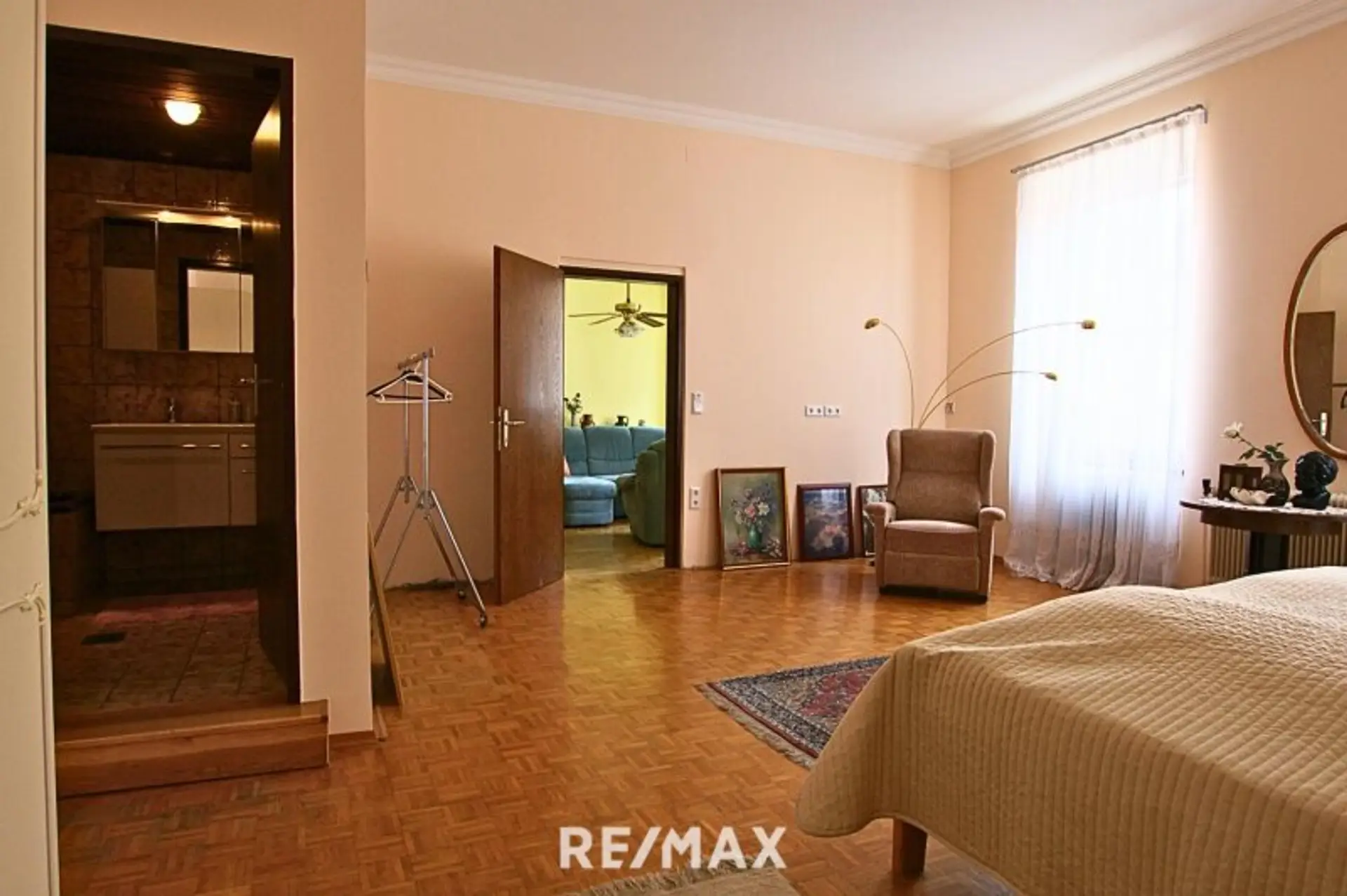 Angrenzend an das Wohnzimmer liegen die beiden weiteren Räume, ein großes Schlafzimmer mit dem Badezimmer, und ein kleinerer, welches als Kinder- oder Gästezimmer genutzt werden kann.