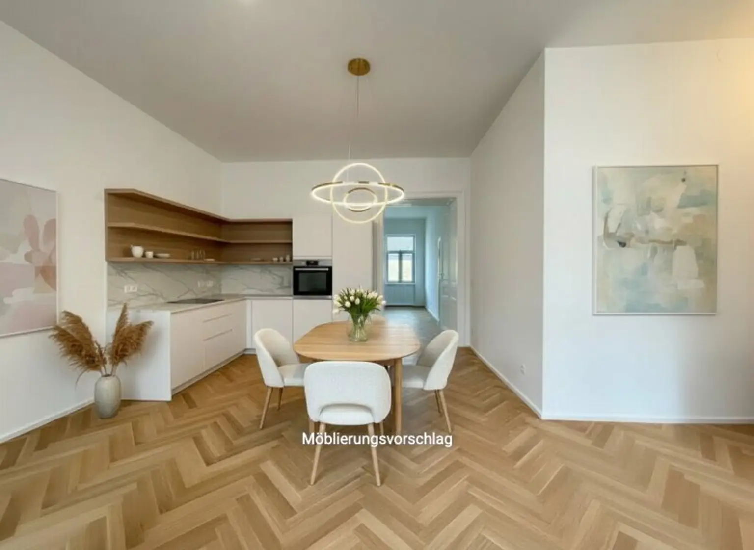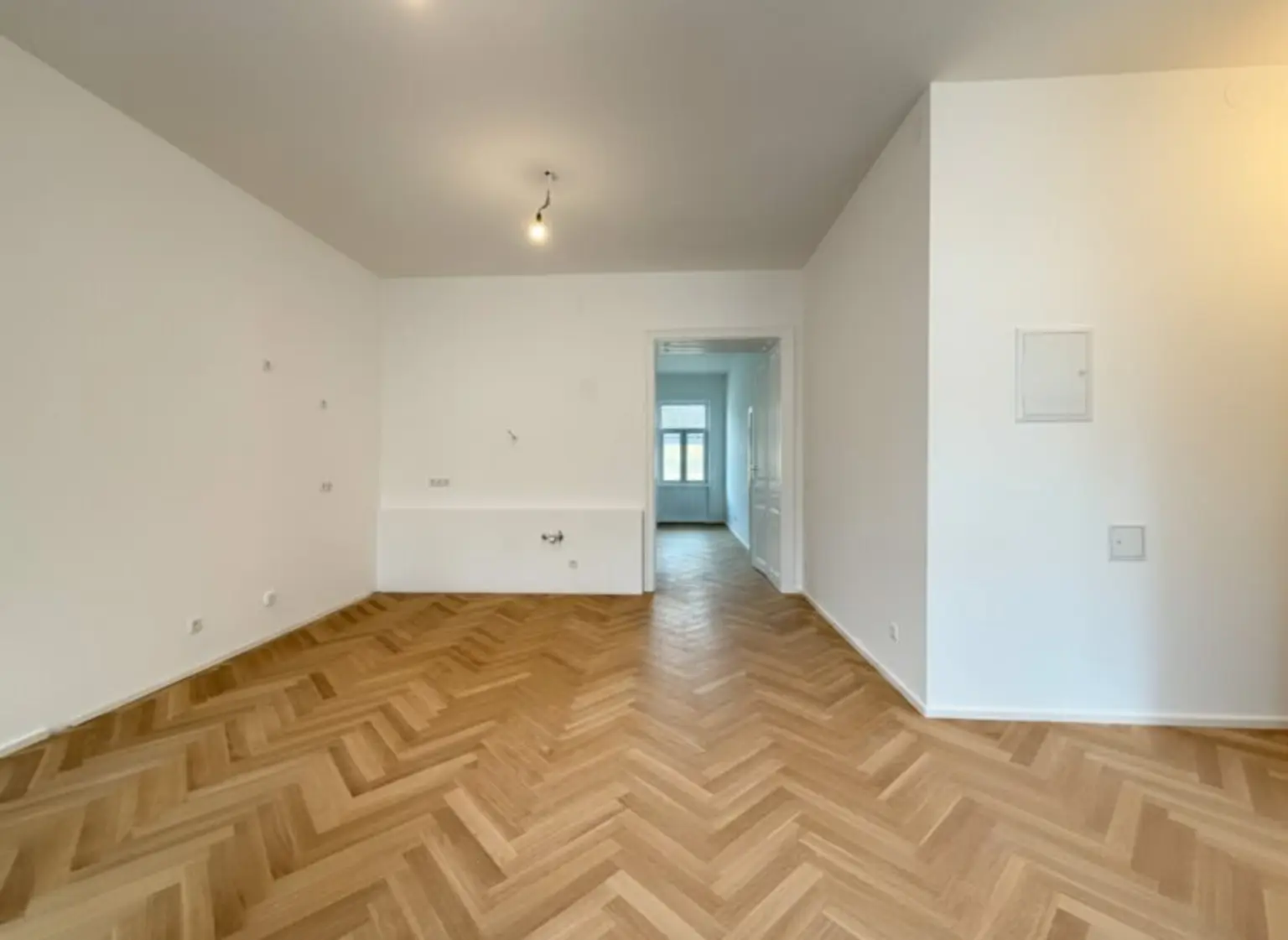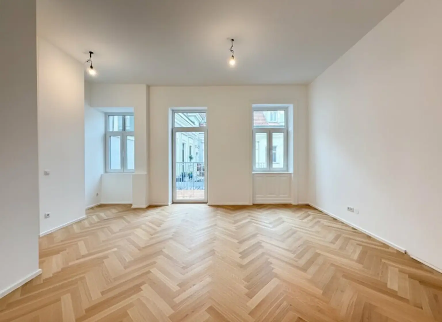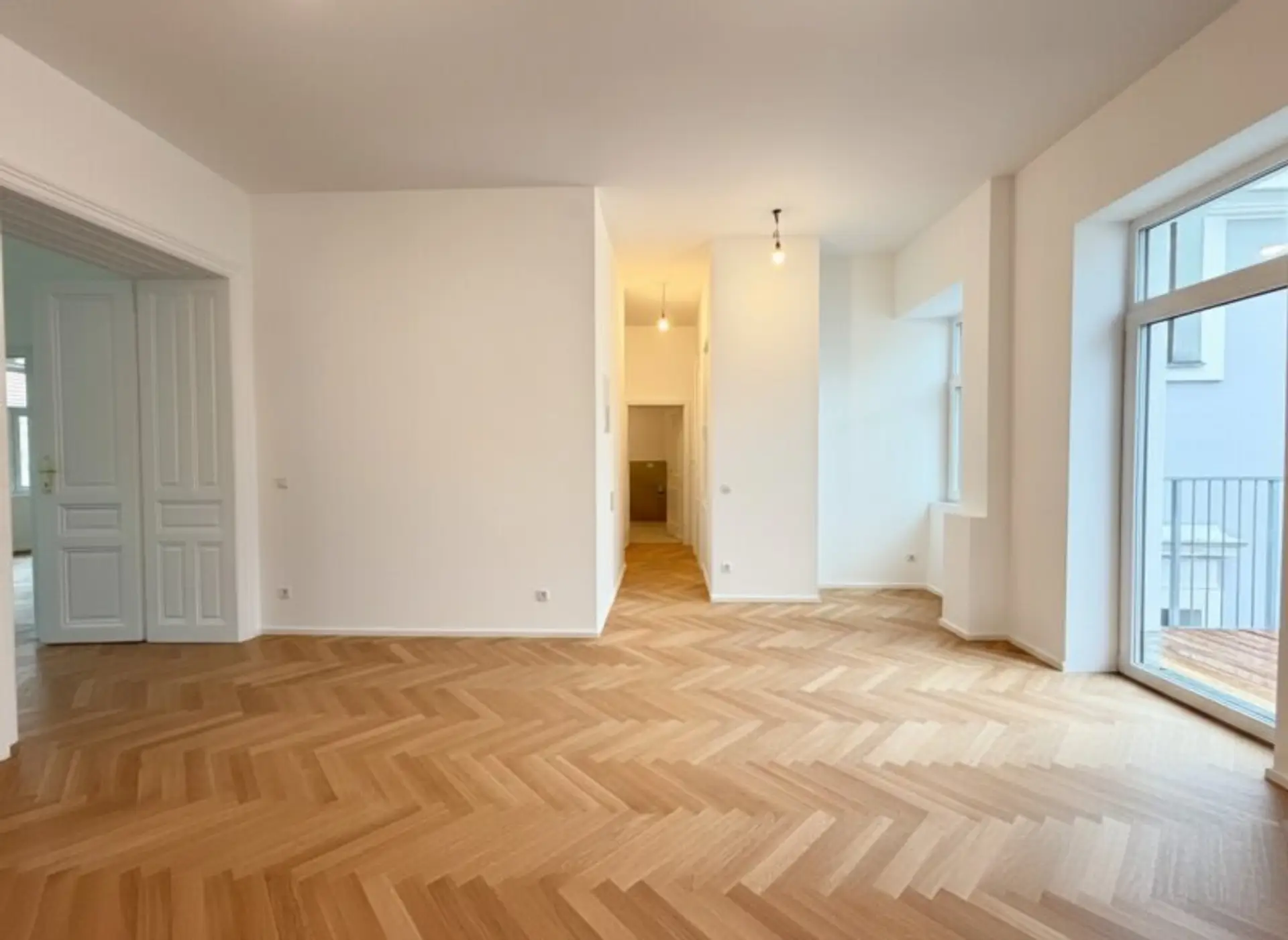 Zeitlose Ausstattung, stilvoller Fischgrätparkettboden, neue 3-fach verglaste Fenster und neue Sanitärgegenstände