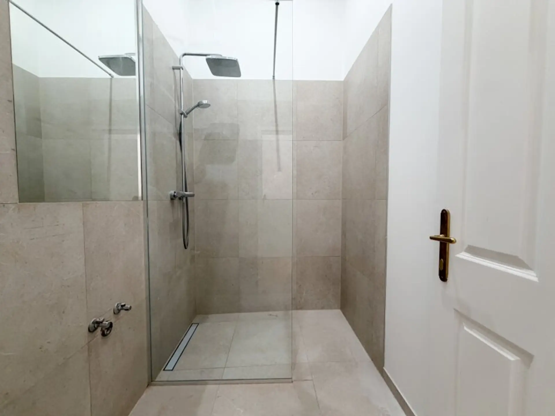 Badezimmer mit Dusche und Oberlichte (= Tageslicht) in Richtung Küche