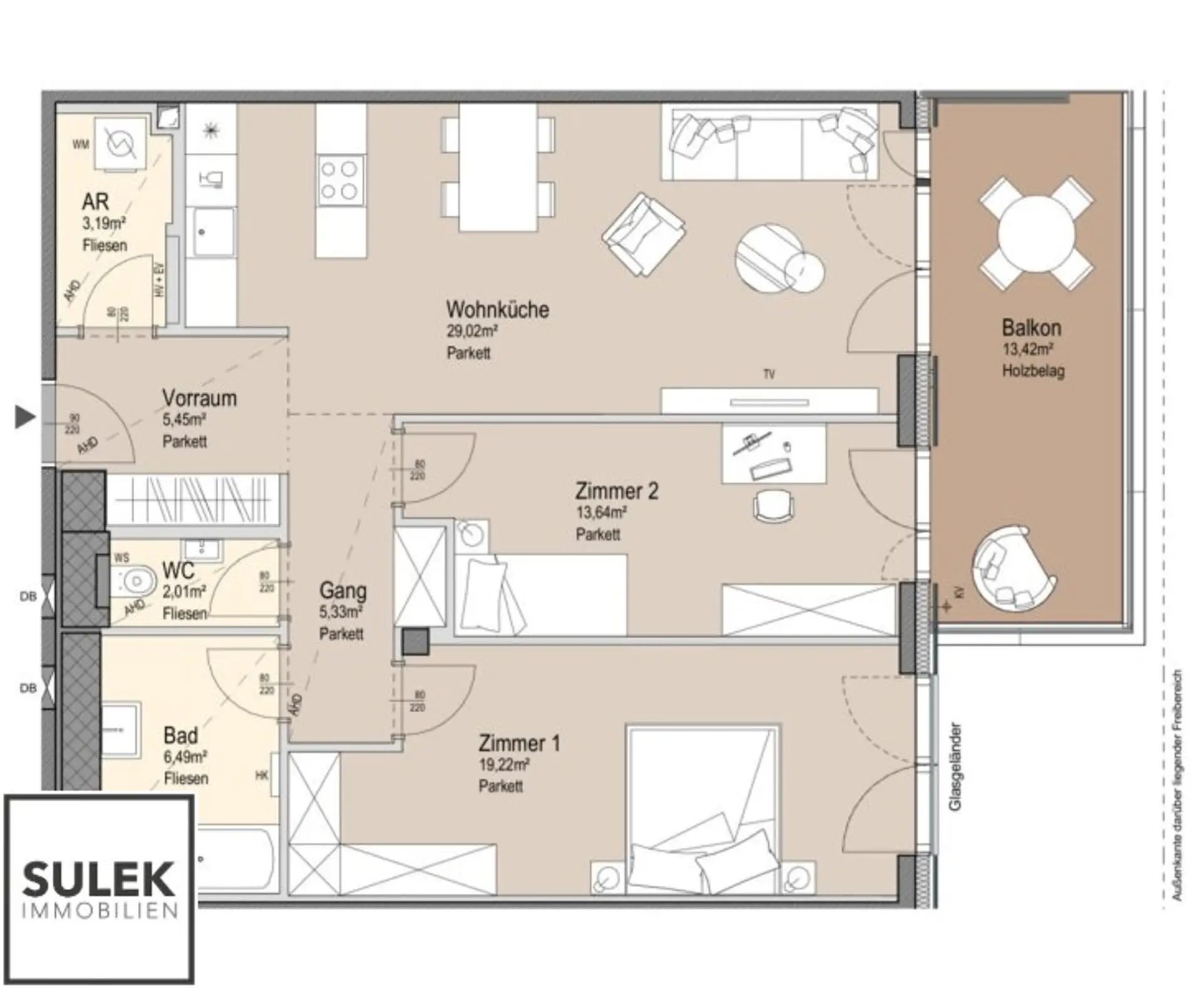 * 13 m² großer Balkon mit Holzbelag und Glasgeländer