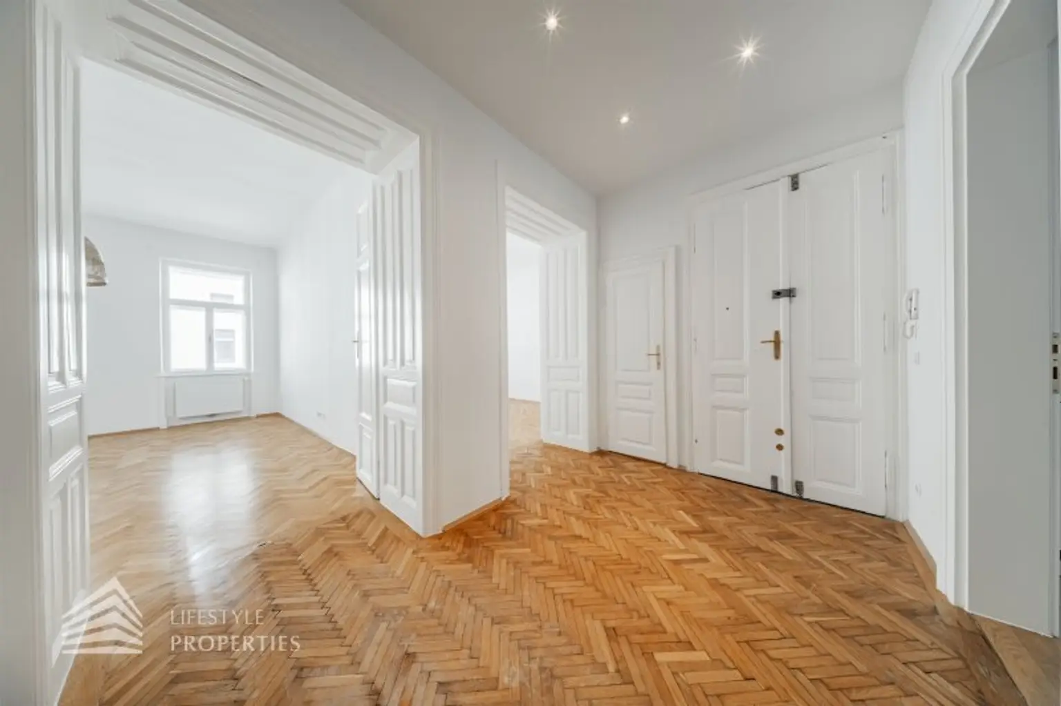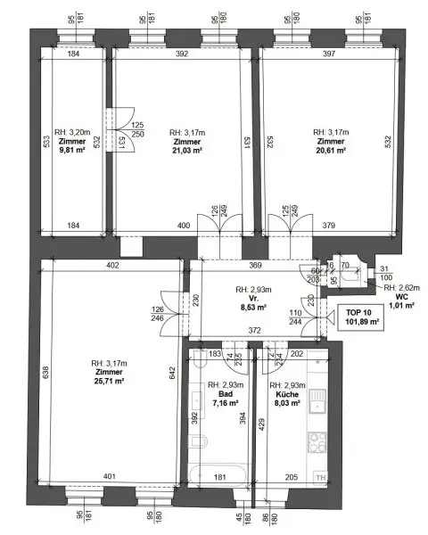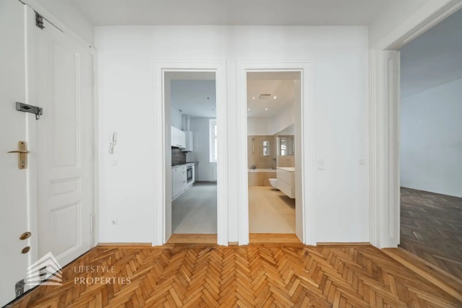 Vom zentralen Eingangsbereich mit Vorraum befindet sich auf der linken Seite die Küche sowie gleich daneben das separate Bad, vom Vorraum rechts gelangen Sie in das separate WC. Alle 3 großen Zimmer sind zentral vom Vorraum aus begebar, lediglich das Kabinettzimmer ist vom letzten Zimmer aus begehbar - wie im typischen Wiener Altbau üblich.