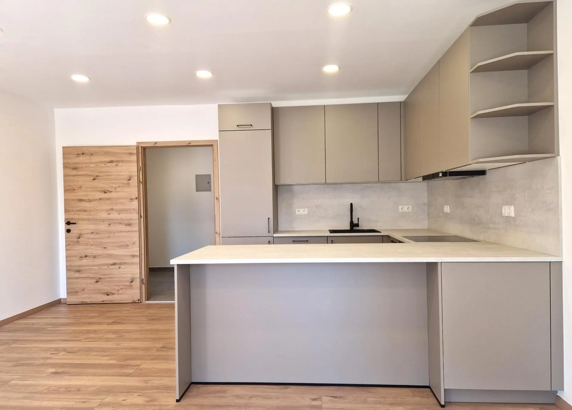 Die moderne Einbauküche fügt sich harmonisch ein und schafft einen idealen Raum zum Kochen, Wohnen und Genießen. Von hier aus gelangen Sie direkt auf die sonnige Loggia – perfekt für entspannte Stunden im Freien.