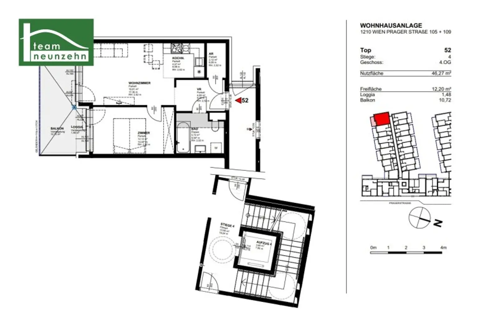 Dank der zentralen Lage an der gut frequentierten Prager Straße profitieren die Bewohner von einer ausgezeichneten Infrastruktur und umfangreichen Einkaufsmöglichkeiten. Direkt gegenüber befindet sich ein BILLA, während auch eine Apotheke, verschiedene Werkstätten und zahlreiche Restaurants schnell zu erreichen sind. Für größere Einkäufe bietet sich das Shopping Center Nord an, das nur zwei Busstationen entfernt liegt.