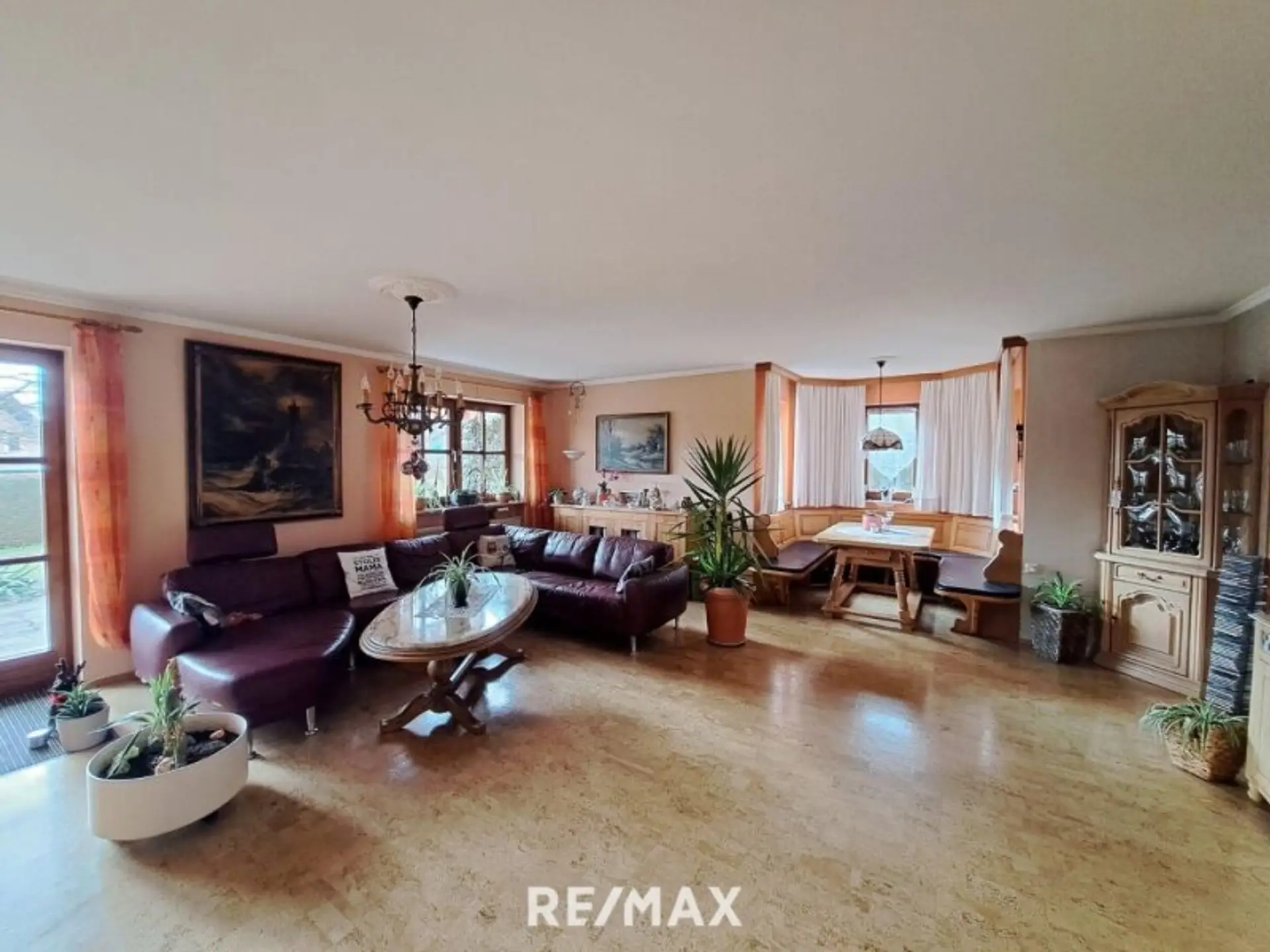 - Wohnzimmer mit Erker und Essbereich, Zugang zum Garten