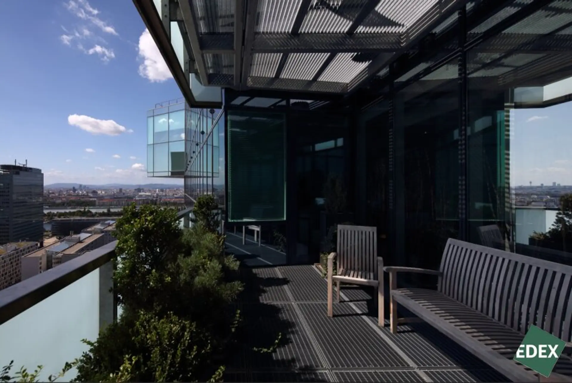 Der Baukörper wird durch ein unverkennbares Wechselspiel von Einschnitten und Erkerelementen strukturiert. Zahlreiche Terrassen und Balkone bieten einen atemberaubenden Blick auf die Stadt und den direkt angrenzenden Donaupark. Großzügige Glasflächen gestatten aber auch einzigartige Ausblicke vom Inneren des Gebäudes. Die einzelnen Geschosse zeichnen sich durch variable Größen und Nutzungsmöglichkeiten aus.