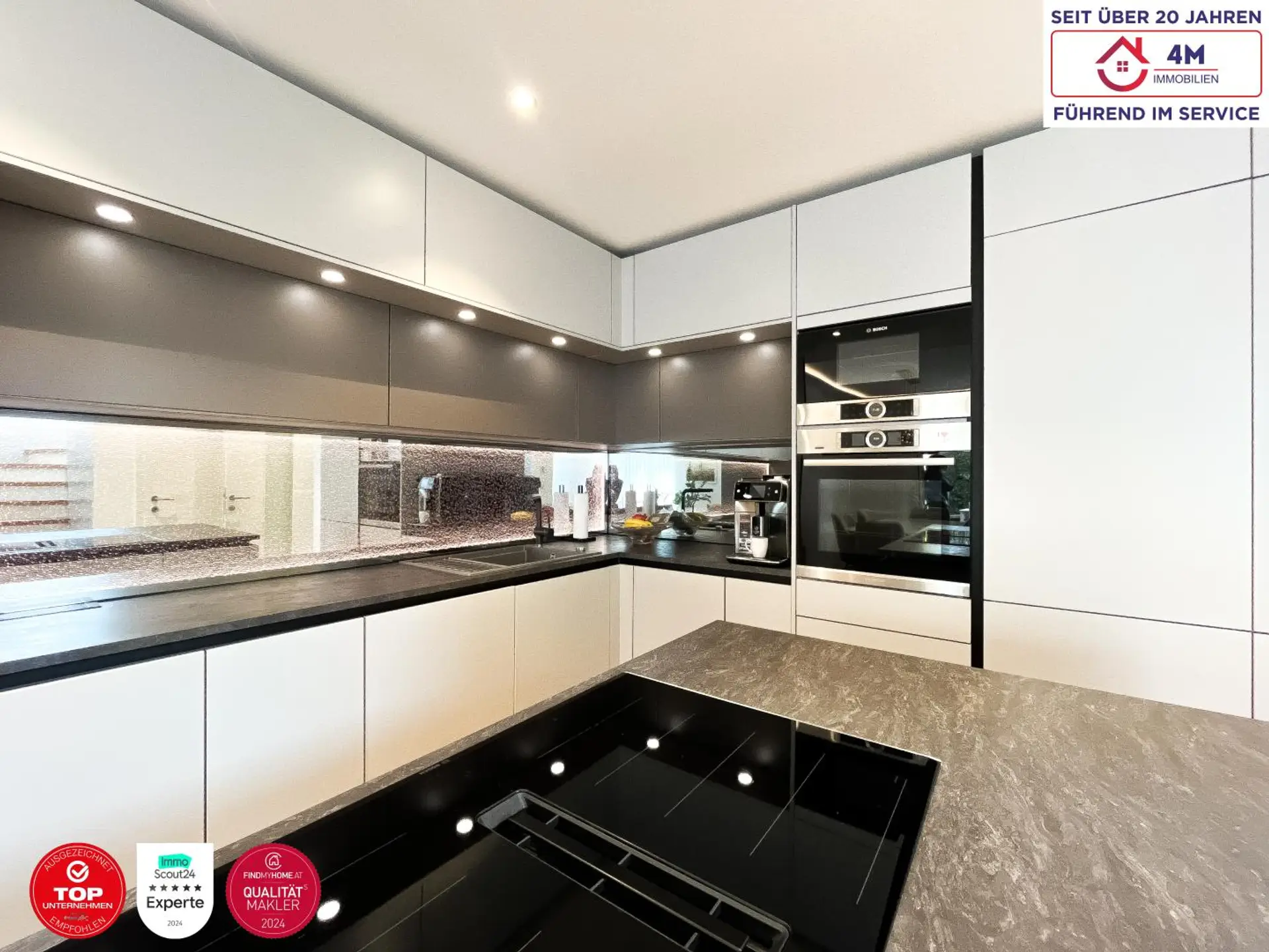 Das Herzstück des Hauses bildet der großzügige Wohn- und Essbereich mit offener Markenküche, ausgestattet mit High-End-Elementen sowie einer integrierten edlen Küchenrückwand aus Farbglas (Fa. Glaszone – Farbkristalle). In Kombination mit dem hochwertigen Parkettboden, der angenehmen Fußbodenheizung sowie dem modernen Lichtkonzept entsteht ein stilvolles und komfortables Wohngefühl.