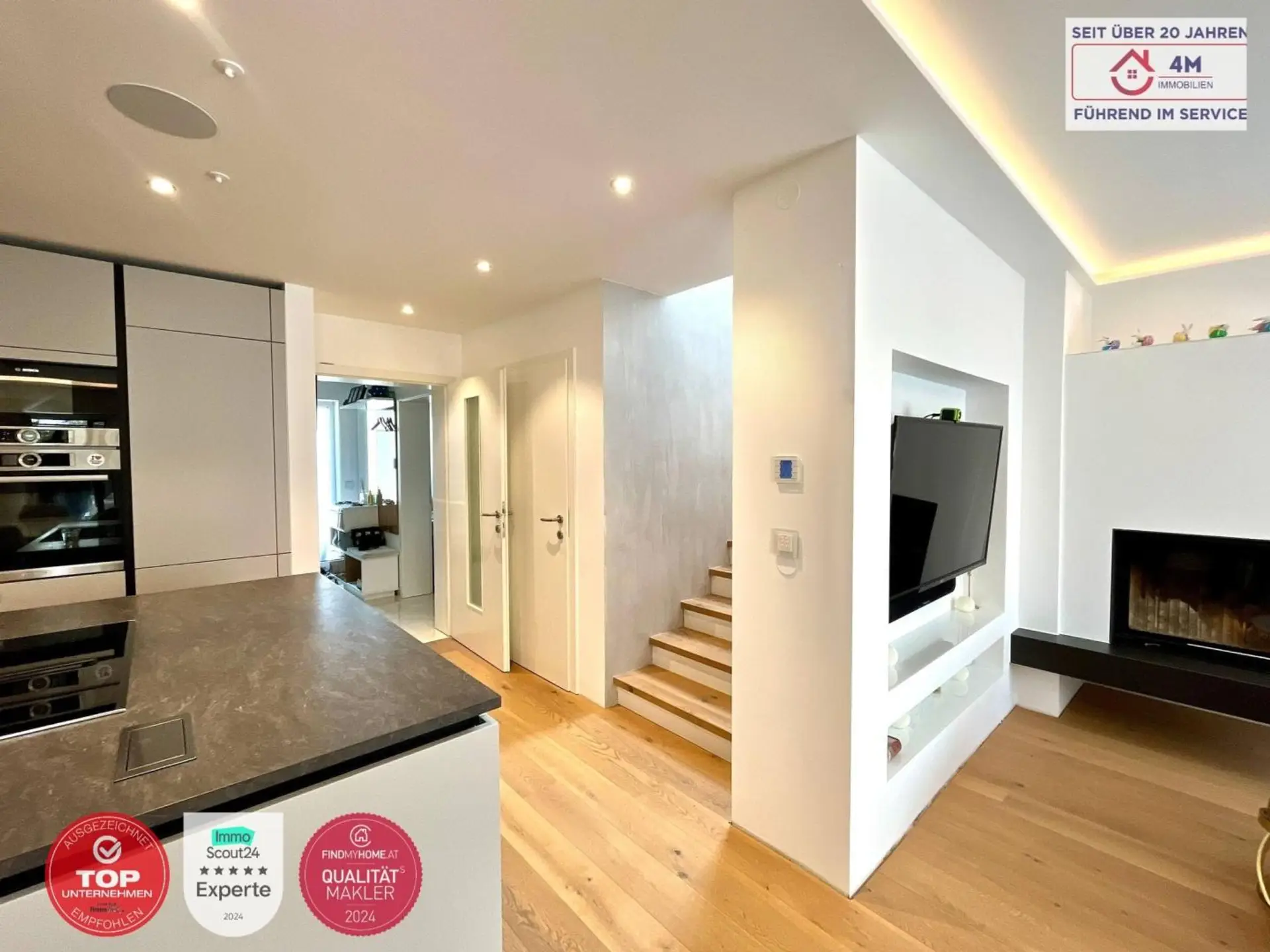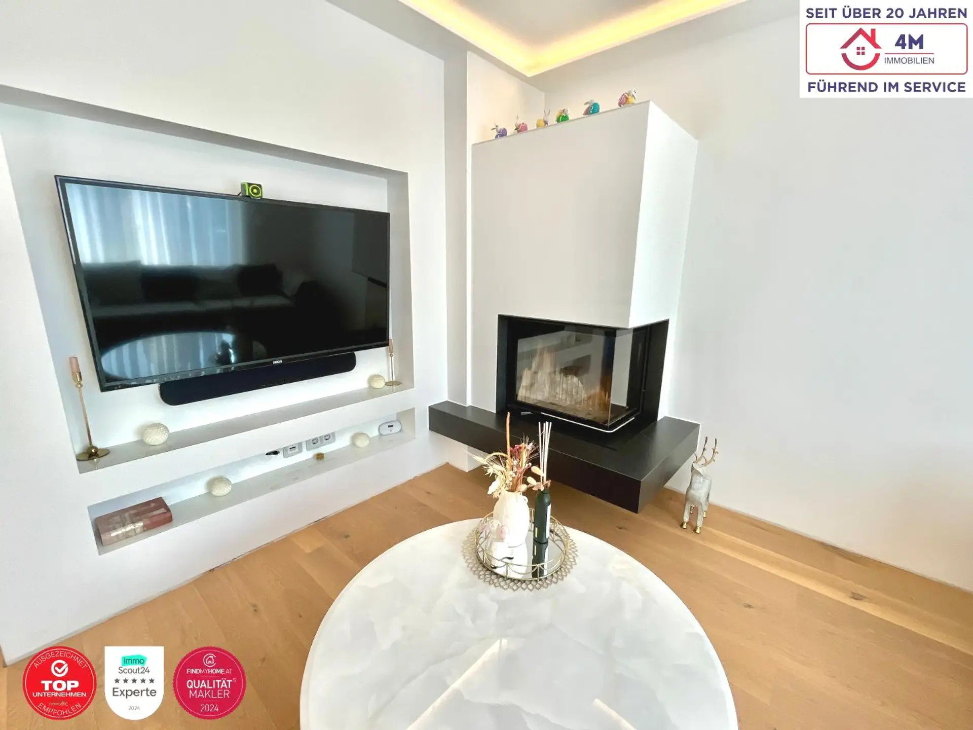 Ein besonderes Highlight ist der exklusive Markenkamin der deutschen Firma Brunner, der dem Wohnbereich eine elegante und zugleich gemütliche Atmosphäre verleiht.