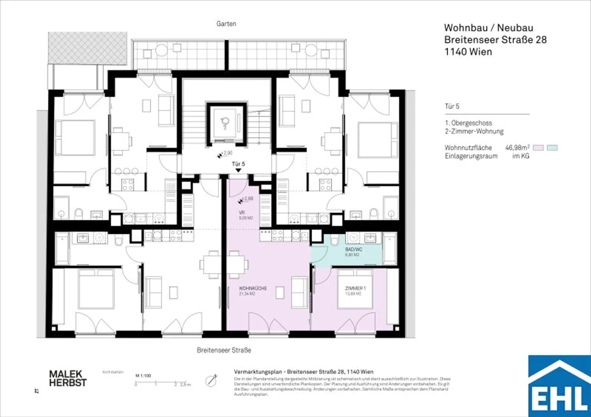 Das Haus präsentiert sich als moderne Wohnanlage mit insgesamt 19 hochwertig ausgestatteten Wohnungen, die zeitgemäßen Wohnkomfort mit durchdachter Funktionalität verbindet. Für zusätzlichen Komfort sorgen Einlagerungsräume im Kellergeschoss für jede Wohnung, ein Fahrradraum, Fahrradstellplätze im Innenhof sowie ein Kleinkinderspielplatz für die jüngsten Bewohner. Die Kombination aus Luftwärmepumpe und Photovoltaikanlage sorgt für eine nachhaltige Energieversorgung, während die Wärme gleichmäßig über die Fußbodenheizung abgegeben wird. Ein außenliegender Sonnenschutz und die Fußbodenkühlung sorgen für ein angenehmes Wohnklima; in den Dach- und Erdgeschosswohnungen ergänzt eine Klimaanlage den Komfort. – ideal für warme Sommertage. Das Projekt vereint moderne Technik, nachhaltige Energieeffizienz und hochwertige Ausstattung zu einem stimmigen, zukunftsorientierten Wohnkonzept.