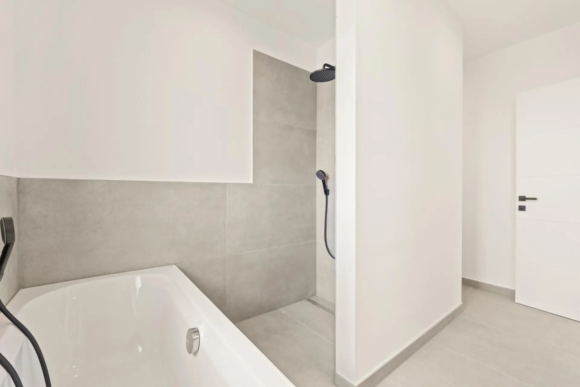 - Badezimmer mit Wanne, Walk-In-Dusche und Doppelwaschbecken