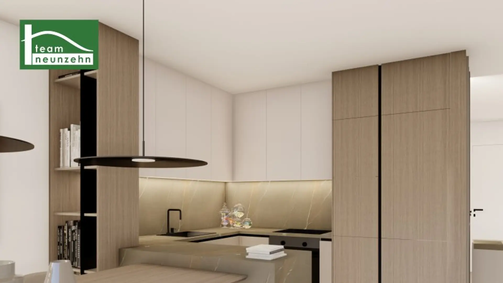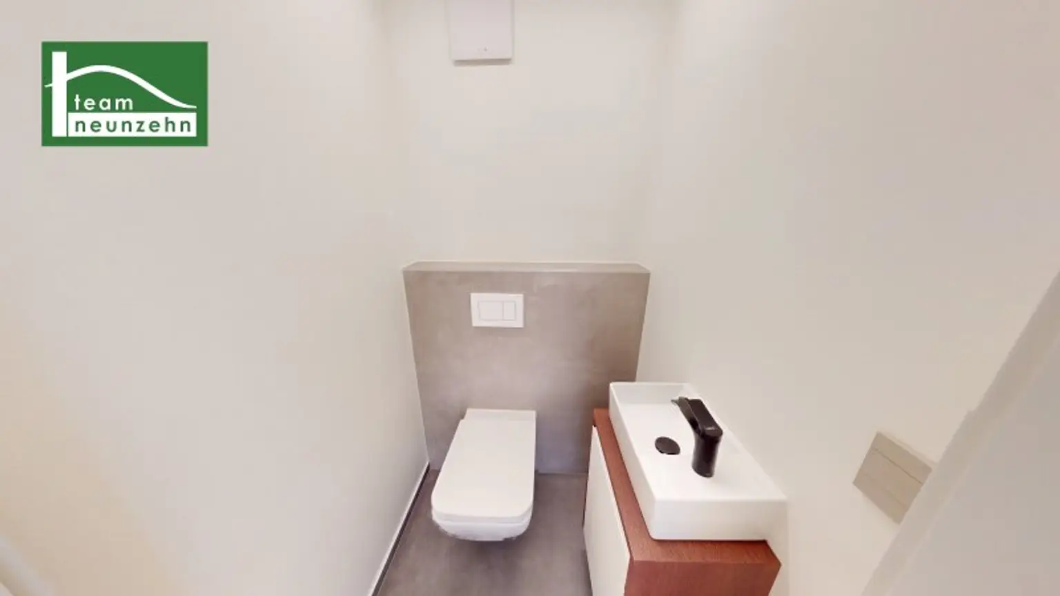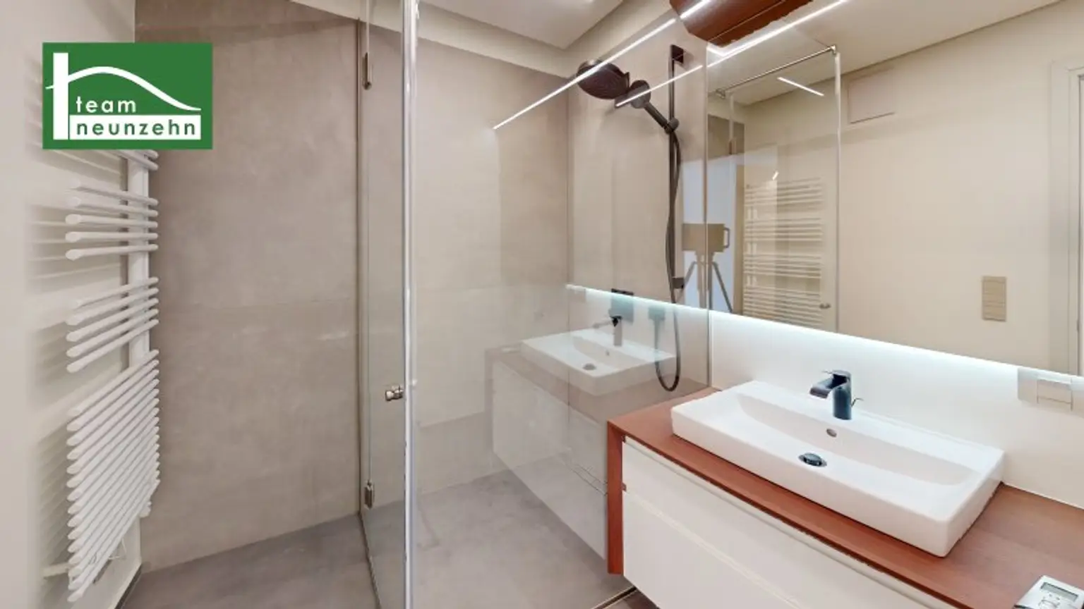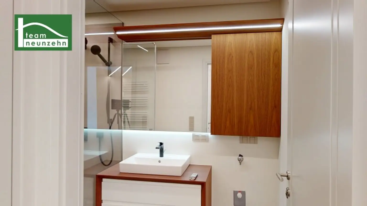 Alle Wohnungen werden schlüsselfertig übergeben: stilvolle Bäder mit Tischlermöbeln, Hans Grohe Armaturen, Villeroy & Boch Sanitärobjekten, Klimageräte und elektrische Raffstores sind bereits inkludiert.