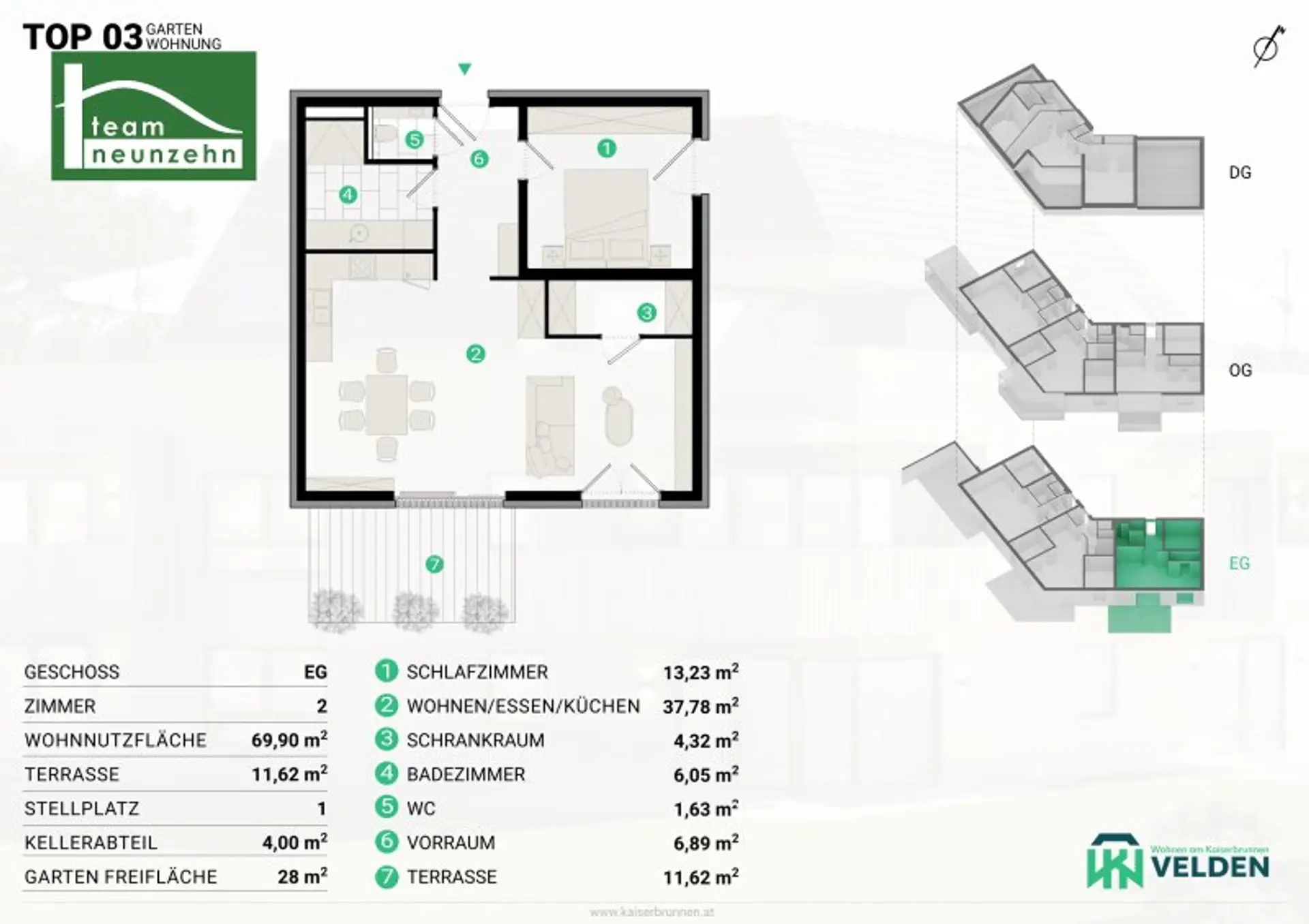 Die Gartenwohnungen im Erdgeschoss (ca. 70–75 m²) bieten privaten Grünraum, ideal für Kinder oder entspannte Stunden im Freien.