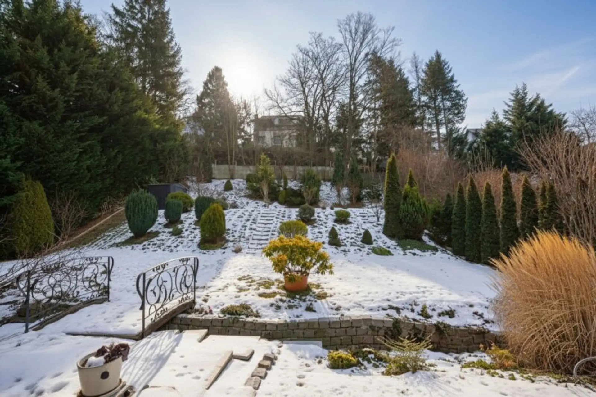 Der terrassierte, liebevoll gepflegte Garten mit Regenwasserzisterne (8.500 l) und Gartenhütte bildet ein weiteres Highlight. Haus und Außenanlagen befinden sich in bezugsfertigem Zustand.