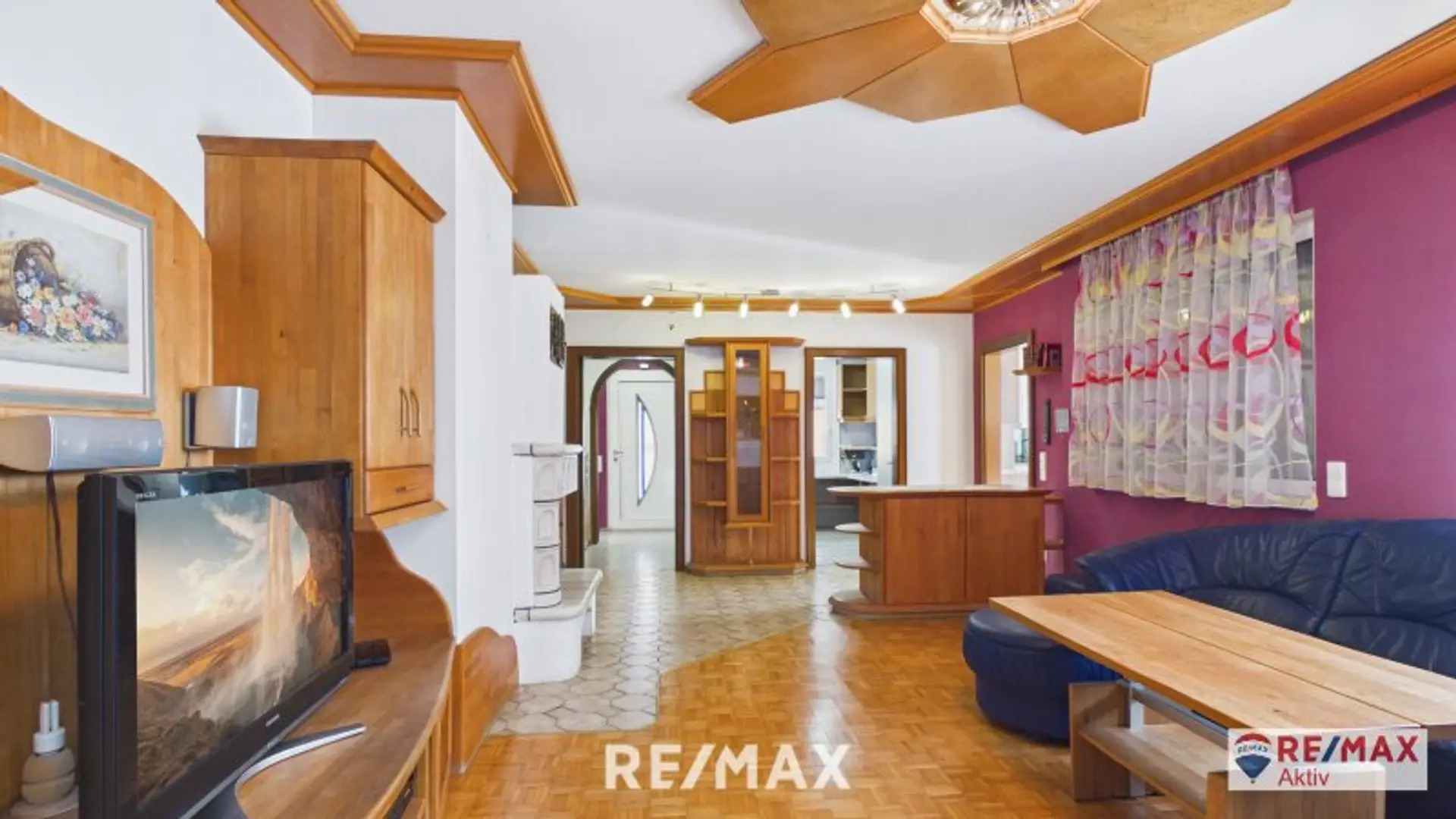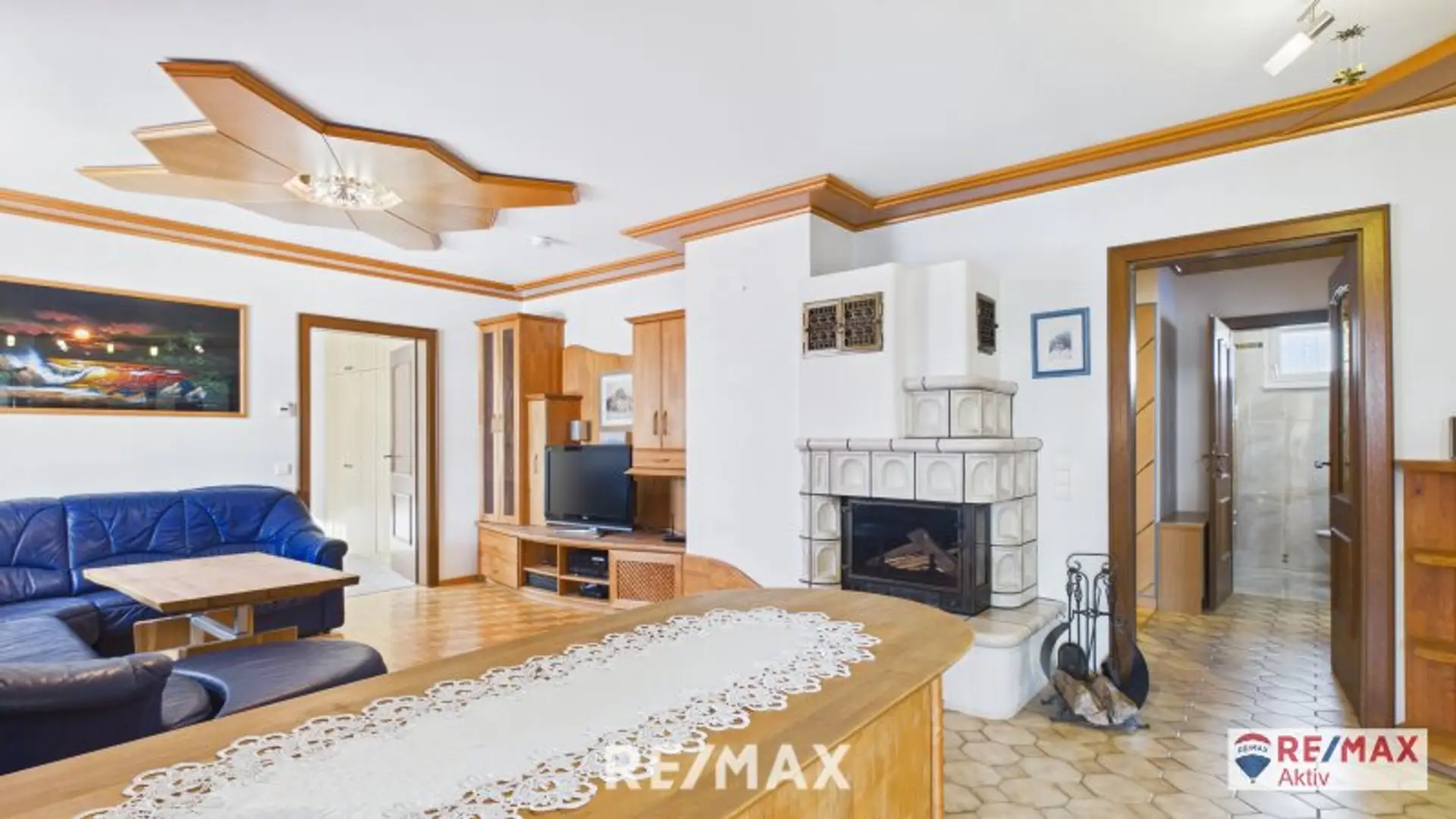 * ein großzügiges Wohnzimmer mit Kachelofen und Zugang zur Terrasse