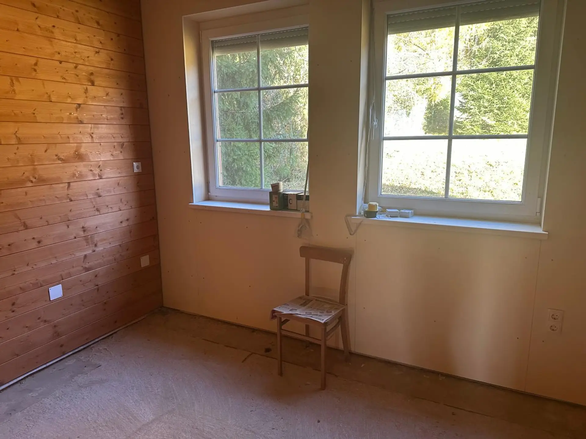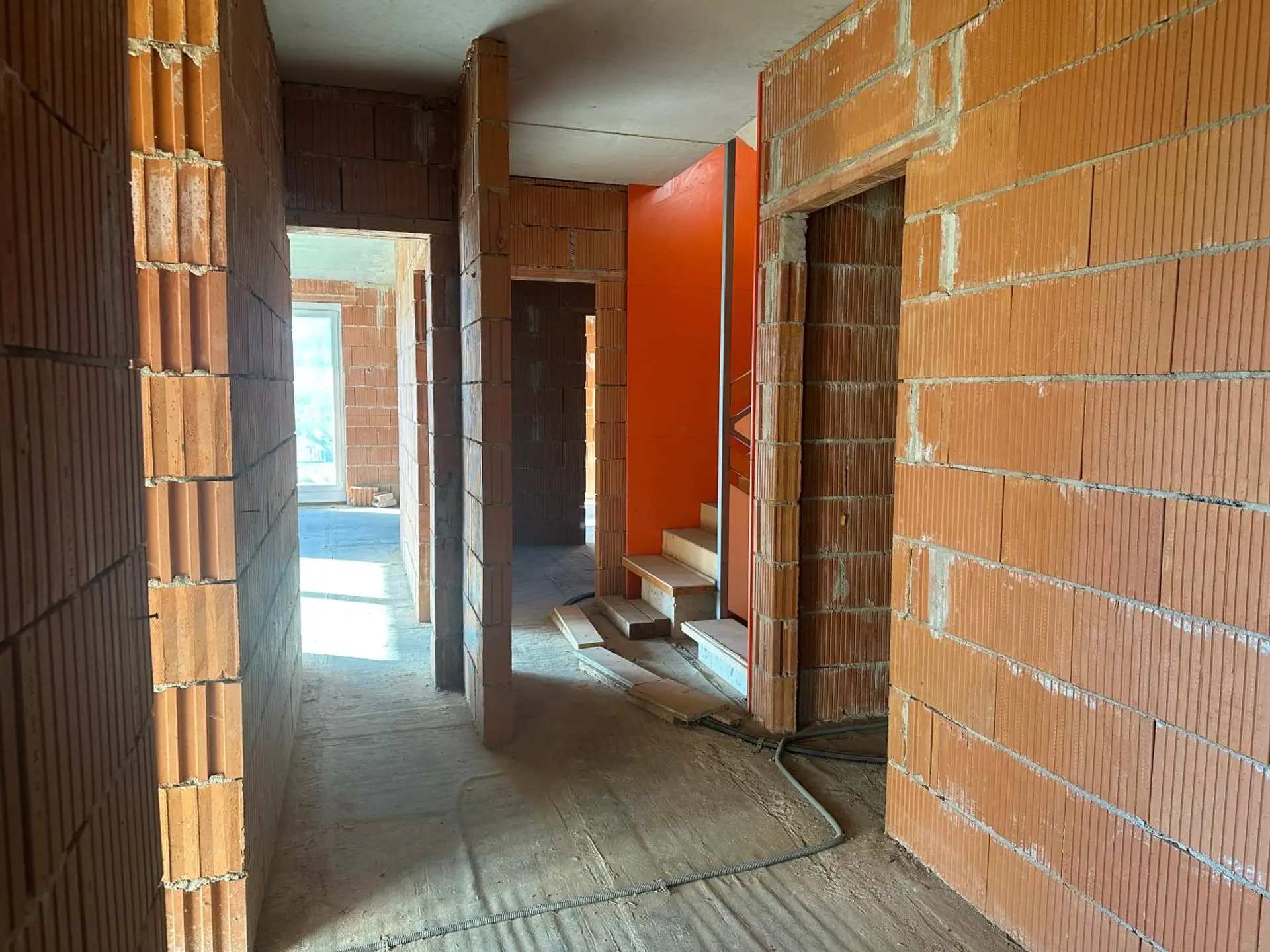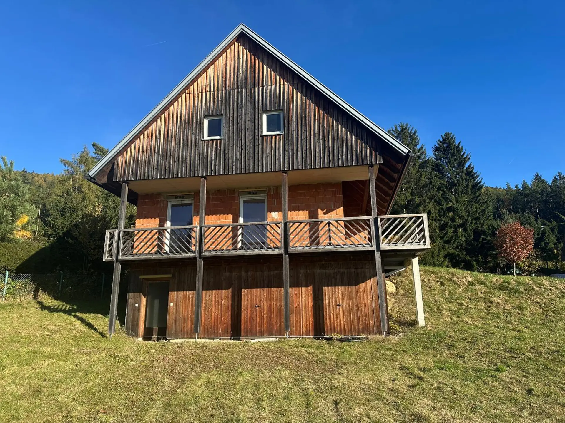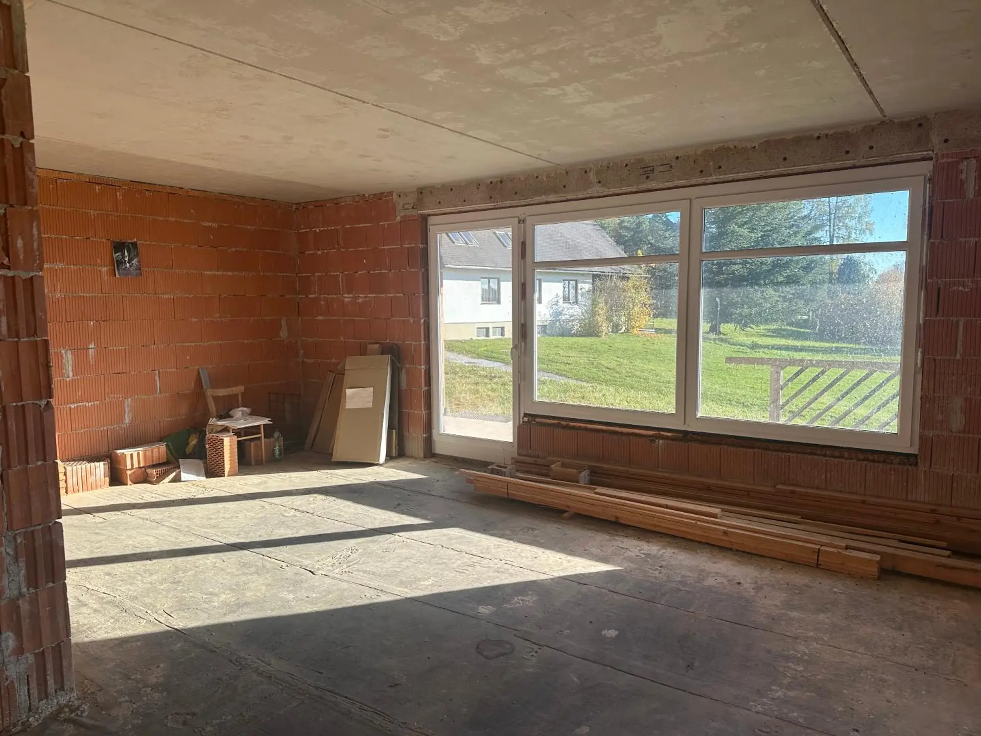 Baustatus: Hochwertiger Rohbau mit sämtlichen Fenstern und Türen bereits installiert; Dach mit Eternit eingedeckt.