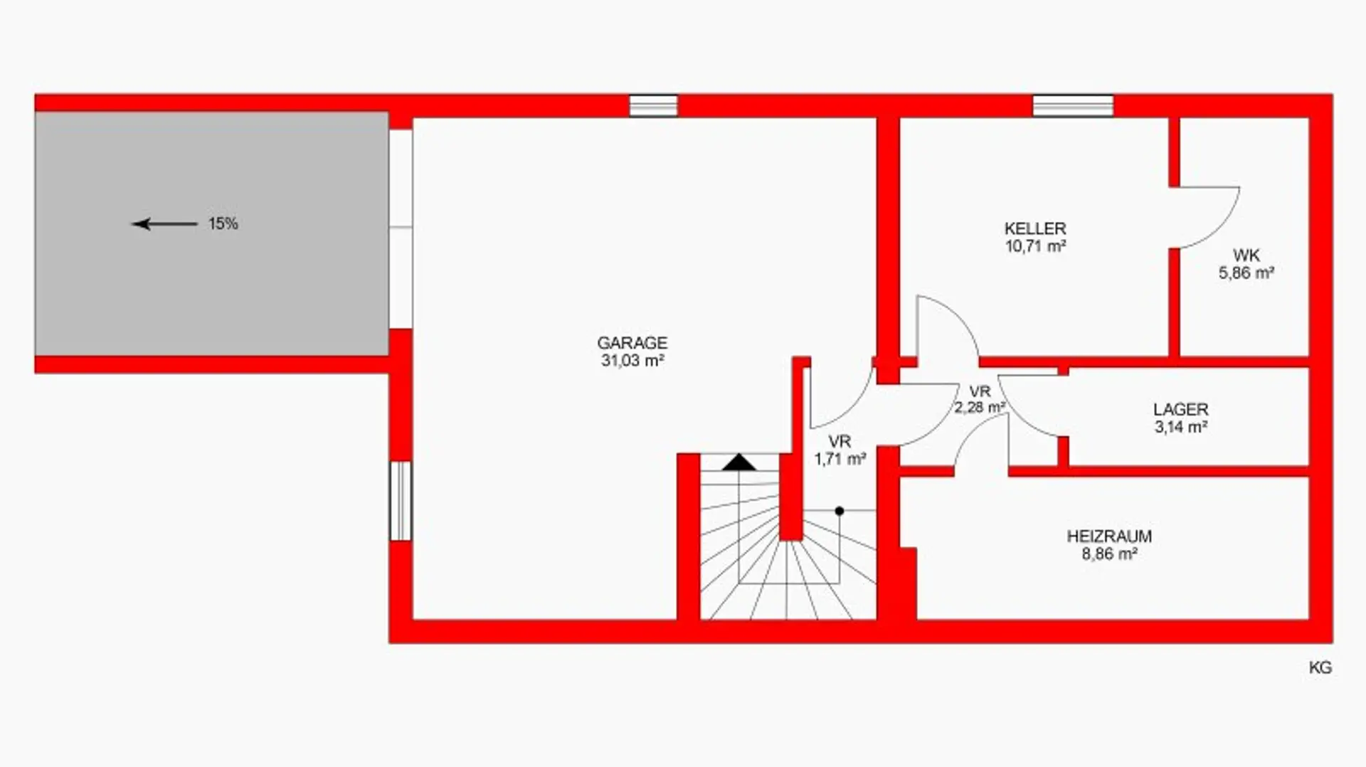 Im Kellergeschoss befinden sich der Technikraum, ein Wirtschaftsraum und zusätzliche Räume für Lagermöglichkeiten.