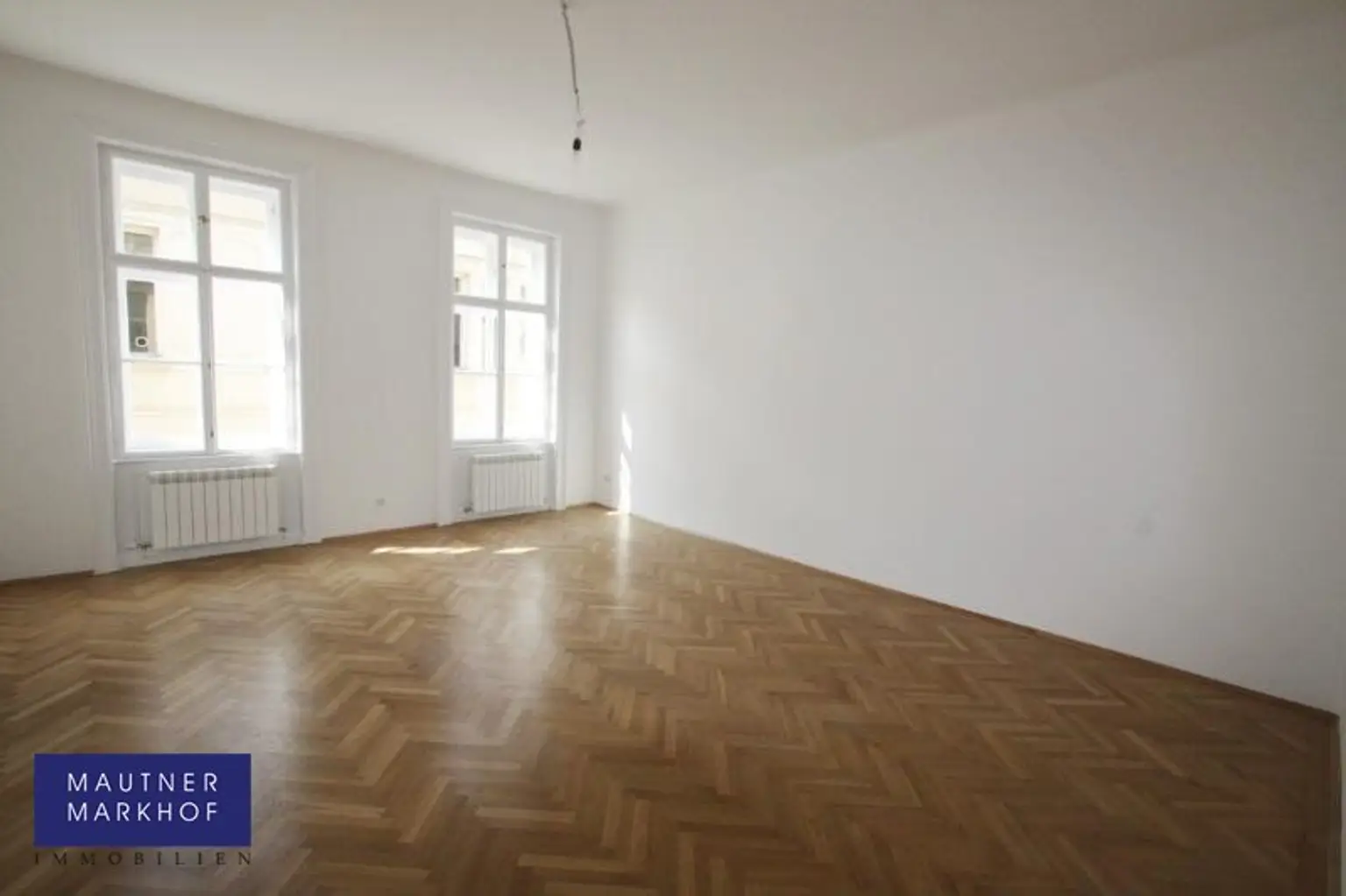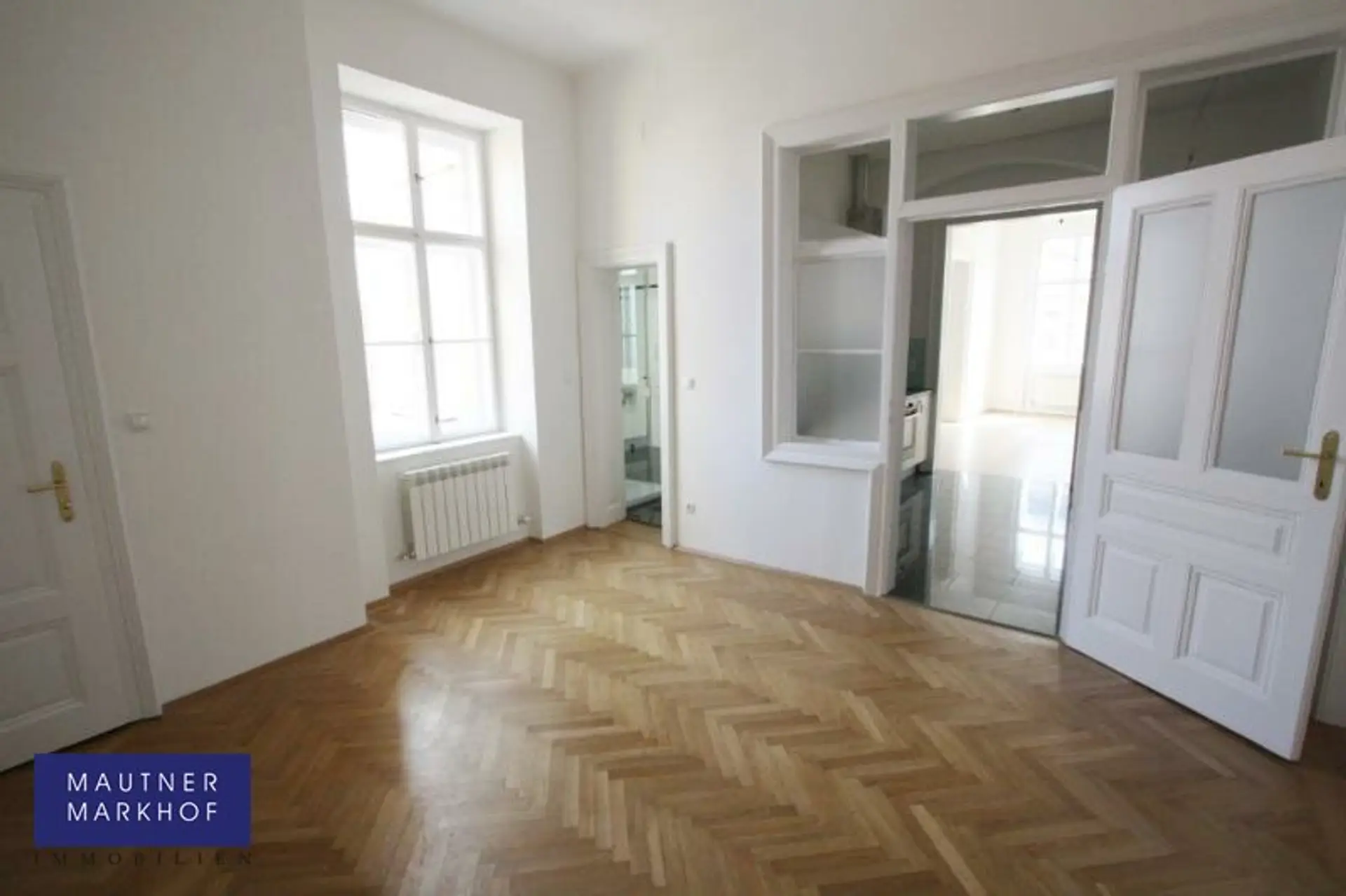 * Wohnsalon mit Sternparkettböden und Ausblick Richtung Peters Kirche