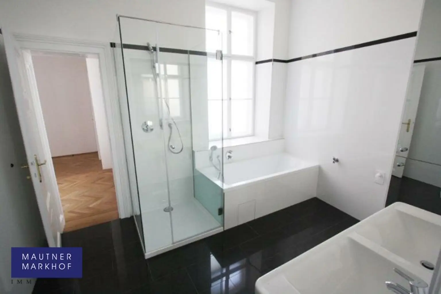 * Bad mit Dusche, Wanne, Doppelwaschbecken und Fenster