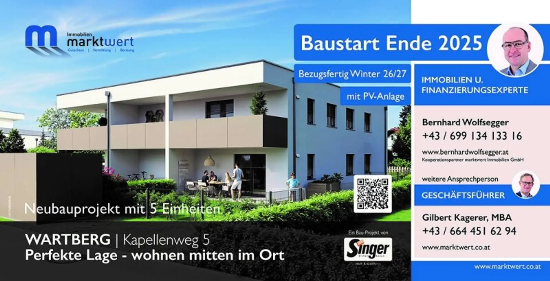 Errichtet wird das Projekt vom renommierten Bauunternehmen SINGER Bau GmbH aus Pregarten – einem verlässlichen Partner mit höchstem Qualitätsanspruch und langjähriger Erfahrung im Massivbau.