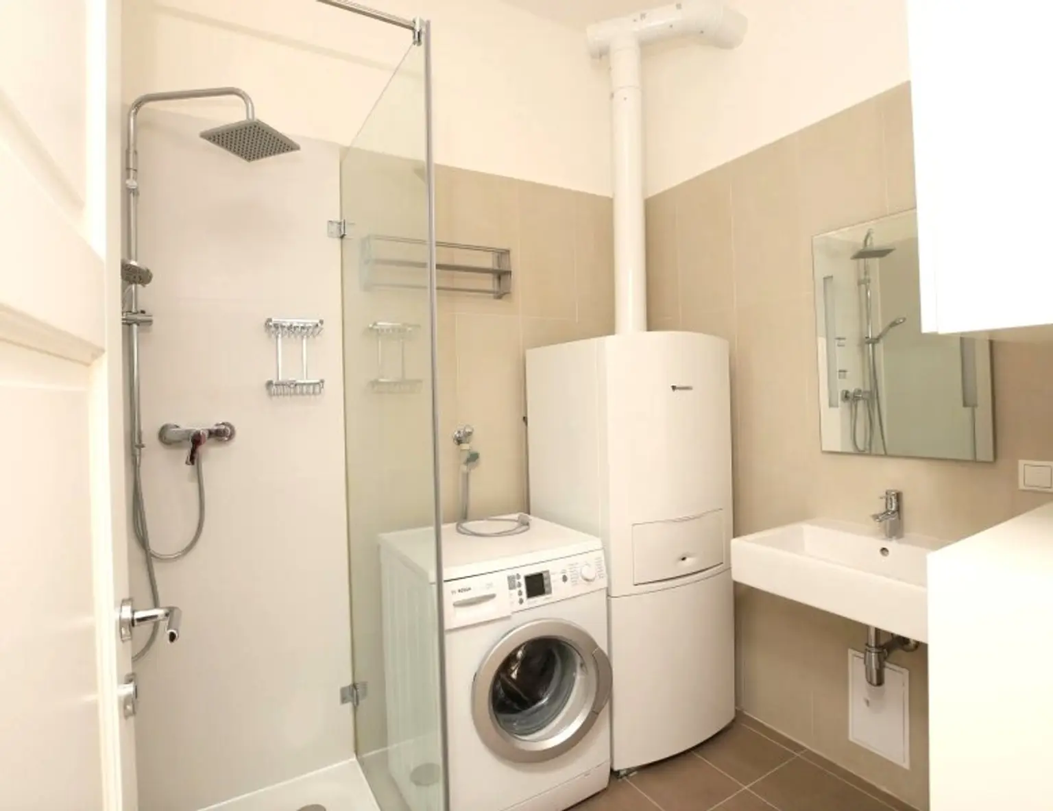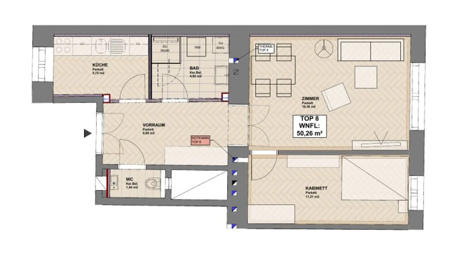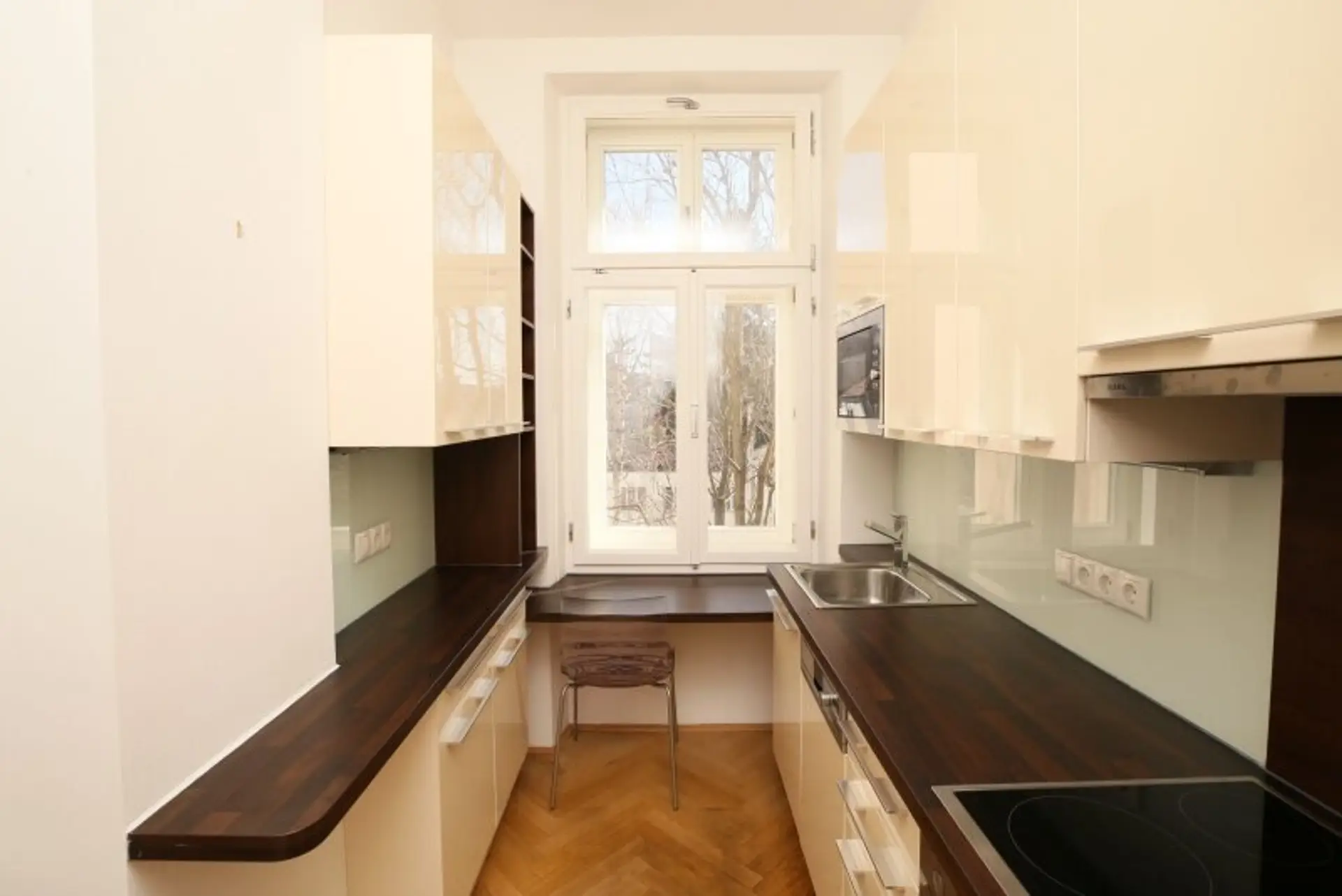 Die Wohnung und das Haus wurden in den Jahren 2012/2013 generalsaniert. Erwähnenswert ist, dass trotz Komplettsanierung der Altbaucharakter der Wohnung erhalten geblieben ist, und zwar durch die Doppelflügeltüre vom Vorraum ins Wohnzimmer und den innenliegenden Holzkastenfenstern.