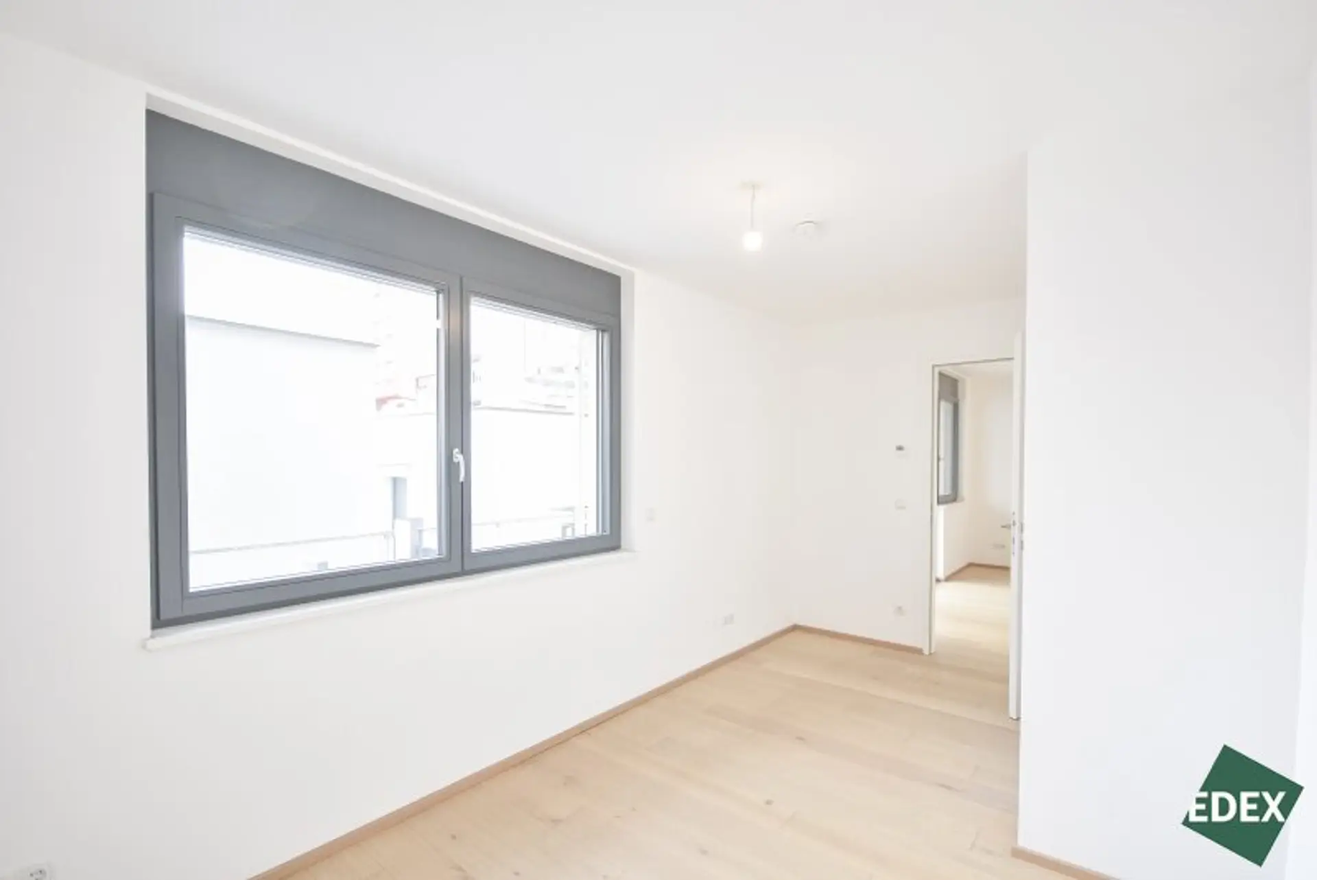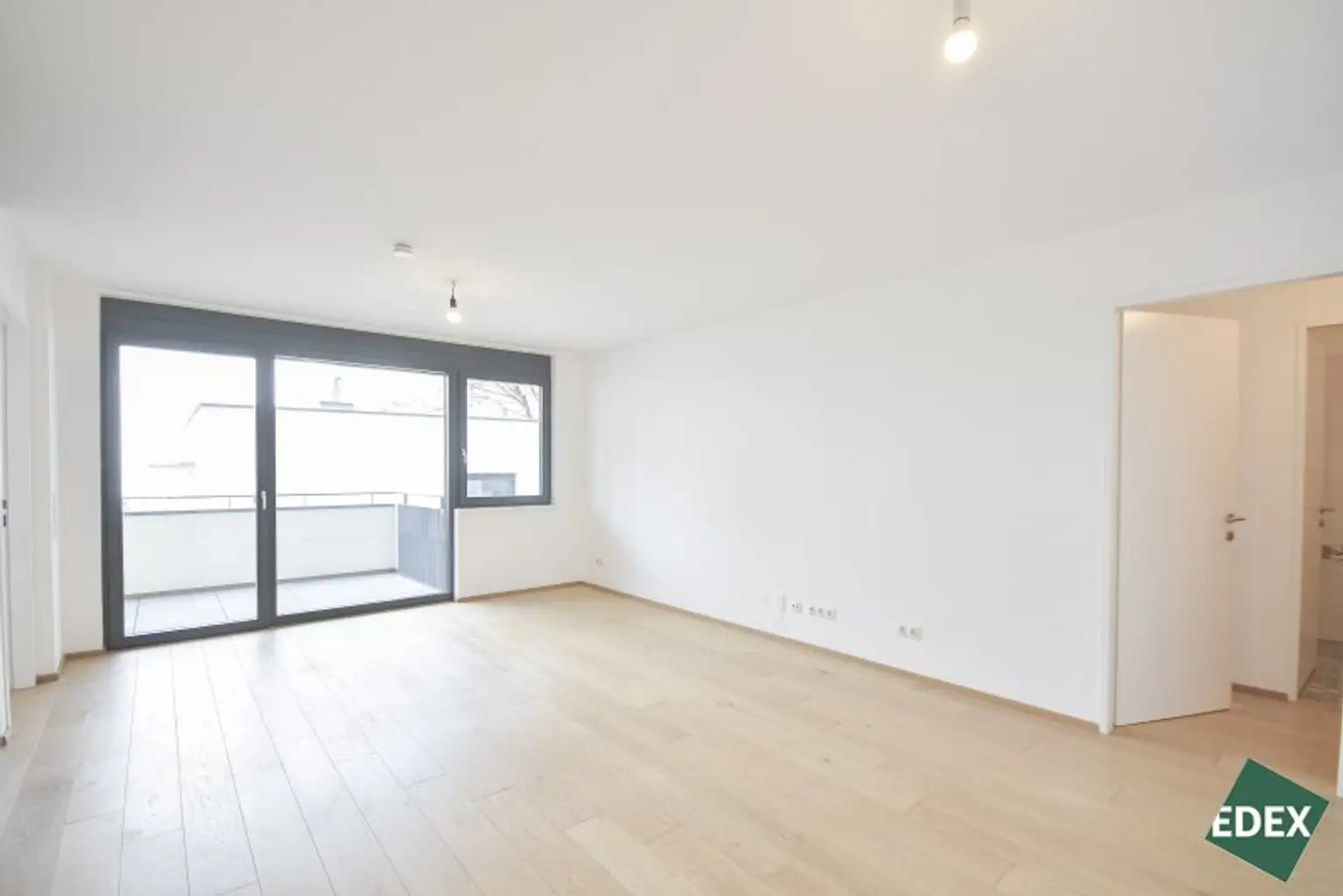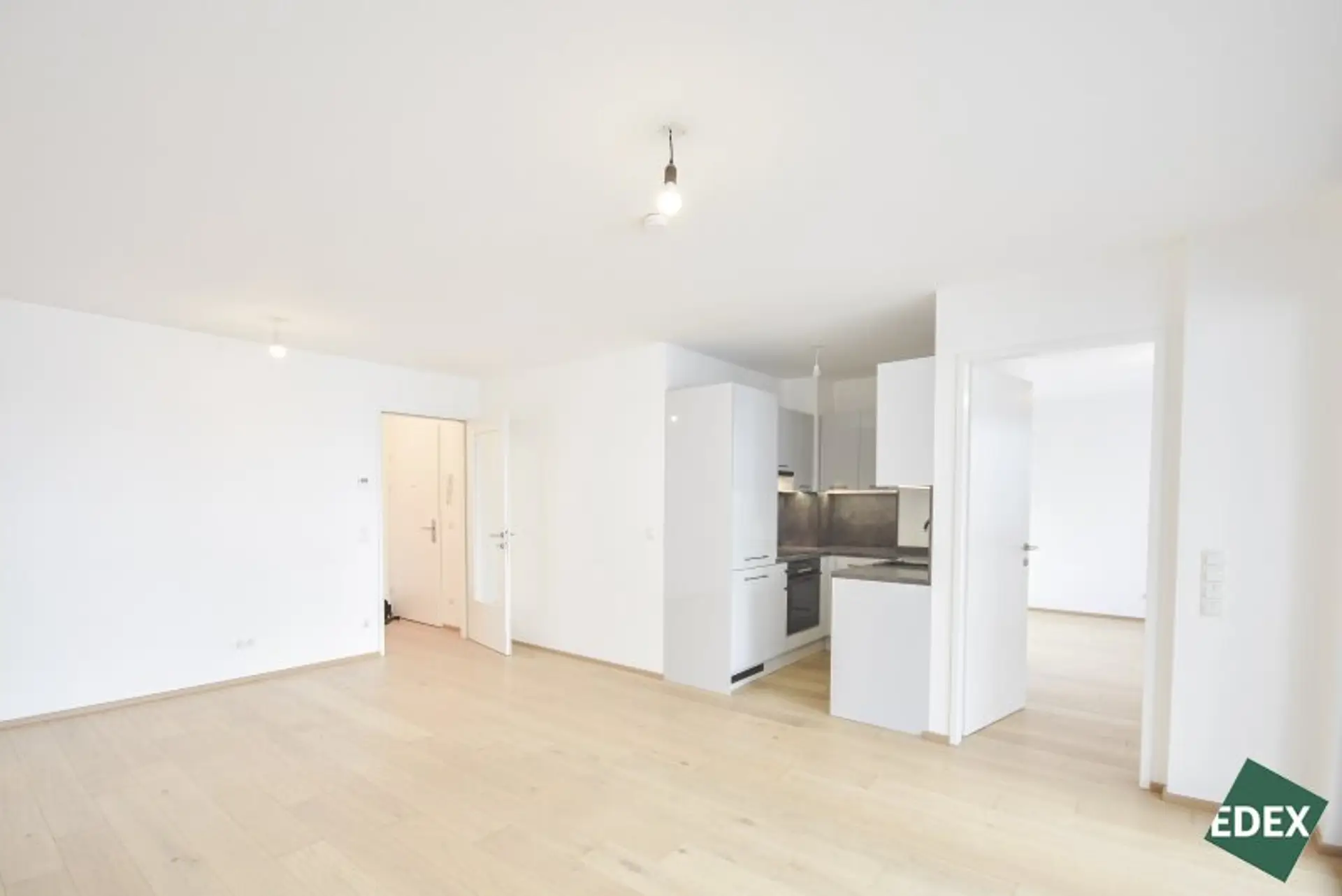 Der zentrale Vorraum erschließt das Wohnzimmer und einen Abstellraum. Die großzügige Wohnküche mit fast 27 m² ist das Herzstück und bietet durch die großen Fensterflächen viel Tageslicht. Angrenzend befindet sich der Balkon – ideal für entspannte Stunden im Freien. Die gesamte Wohnung ist in den ruhigen Innenhof ausgerichtet.