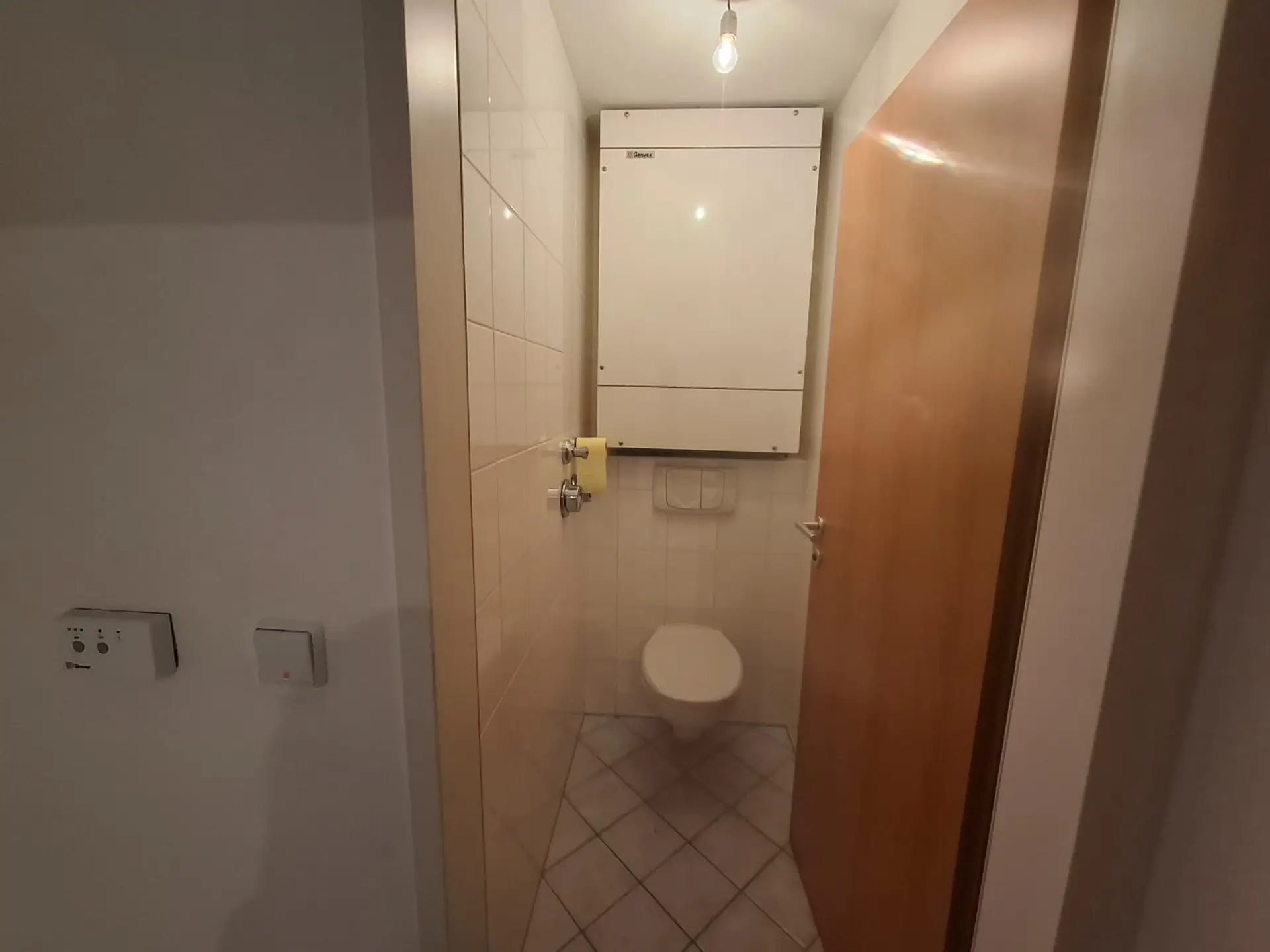 Das modern verflieste Badezimmer ist mit einer Badewanne, einem Handwaschbecken und einem Waschmaschinenanschluss ausgestattet. Das WC ist separat angelegt und ebenfalls modern verfliest.