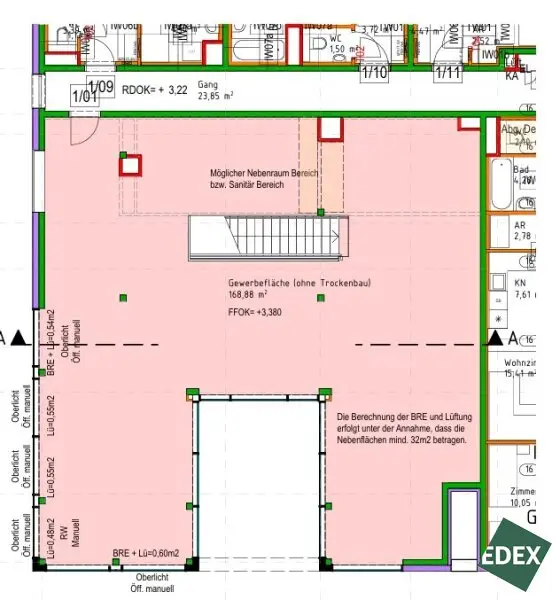 Das Büro befindet sich im 1. Obergeschoss und ist über einen Zugang vom Stiegenhaus erreichbar. Durch den Edelrohbau haben Sie die Möglichkeit, die Flächen ganz nach Ihren eigenen Anforderungen zu gestalten und so optimal an Ihre Bedürfnisse anzupassen. Die großen Schaufenster garantieren Helligkeit und gleichzeitig gute Sichtbarkeit.