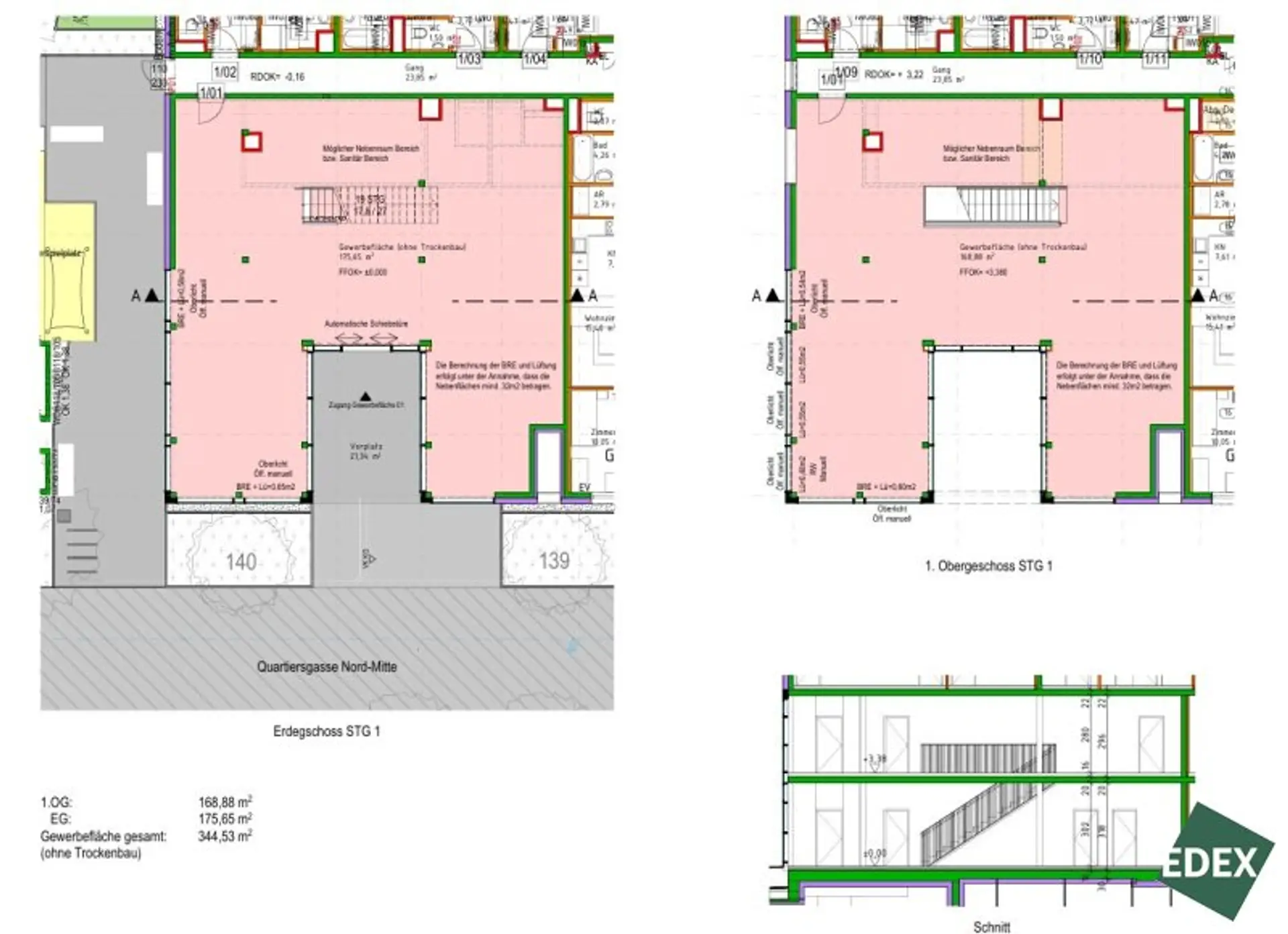 Das Objekt ist derzeit über eine interne Treppe mit einer zusätzlichen Fläche im 1. Obergeschoss verbunden. Beide Flächen können entweder separat oder gemeinsam angemietet werden.