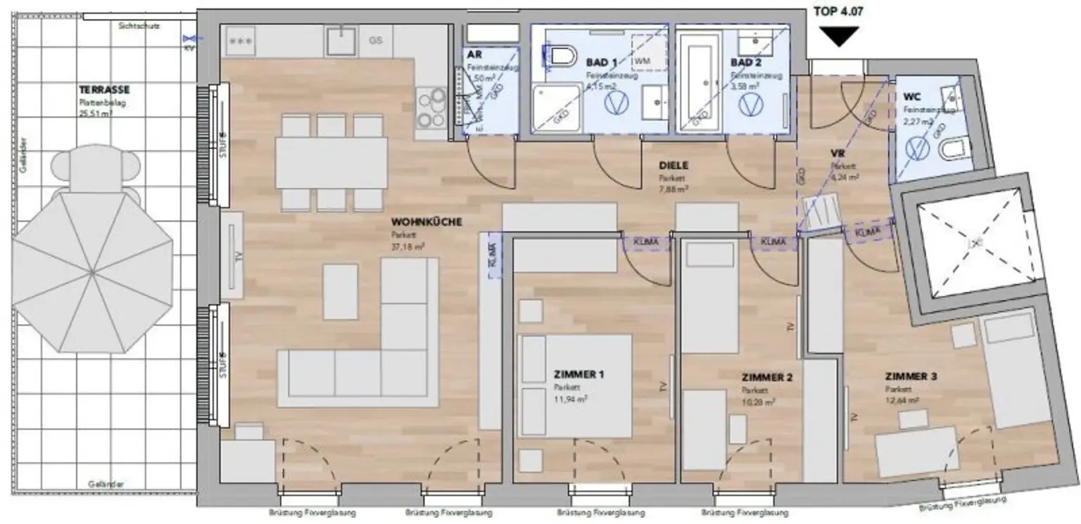 Ausstattung: Boden Bad Gäste-WC Sauna Klimaanlage Fahrradraum Abstellraum Fußbodenheizung Terrasse