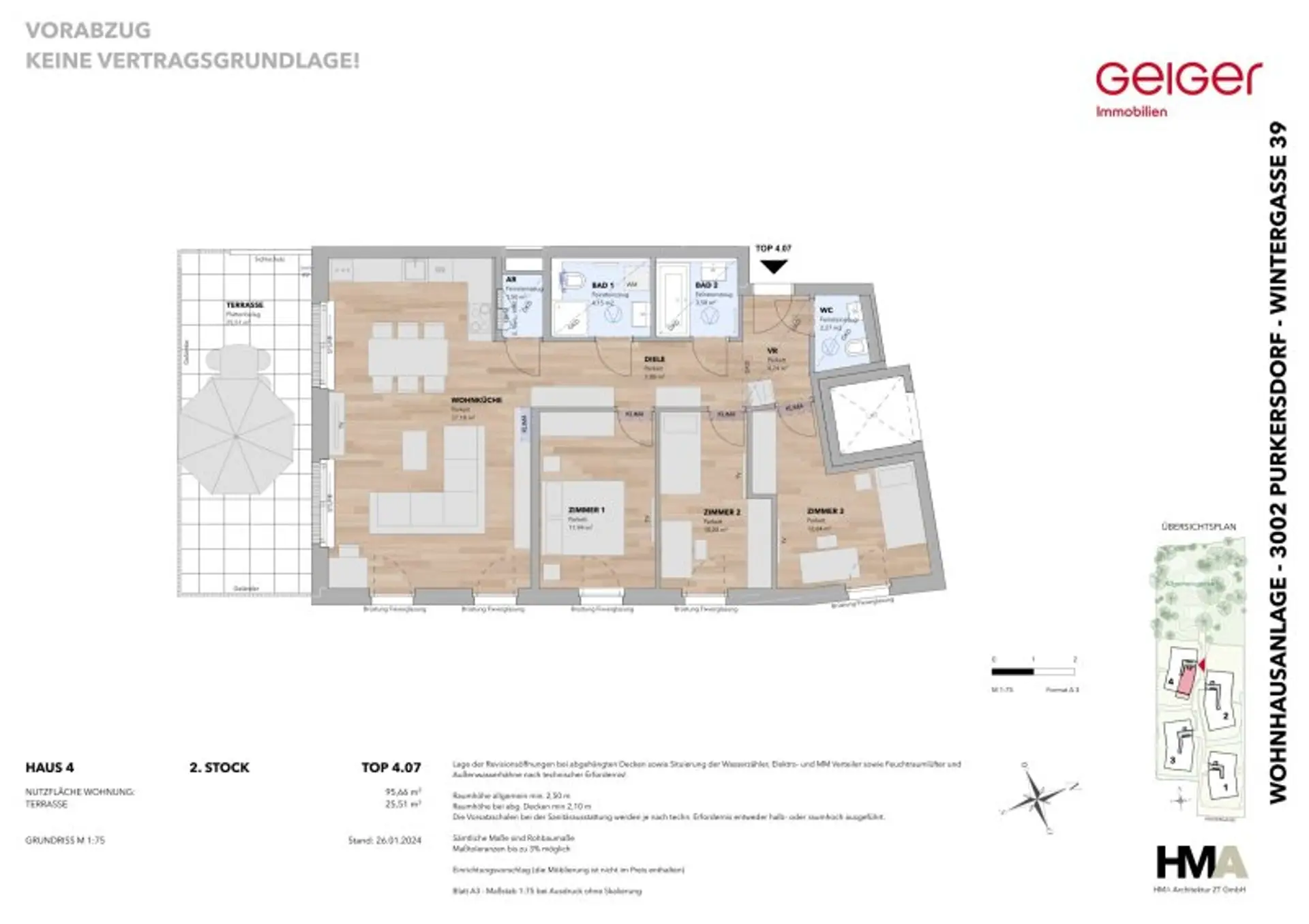 In der zentrumsnahen Wintergasse 39 im beliebten Purkersdorf, errichten wir eine moderne Wohnhausanlage. Diese fügt sich harmonisch in den Hang ein, besteht aus 4 Wohnhäusern mit insgesamt 48 Wohnungen (2-, 3-, 4- und 5-Zimmer Wohnungen), 74 KFZ-Tiefgaragenplätzen, sowie 8 Stellplätzen für Motorräder.