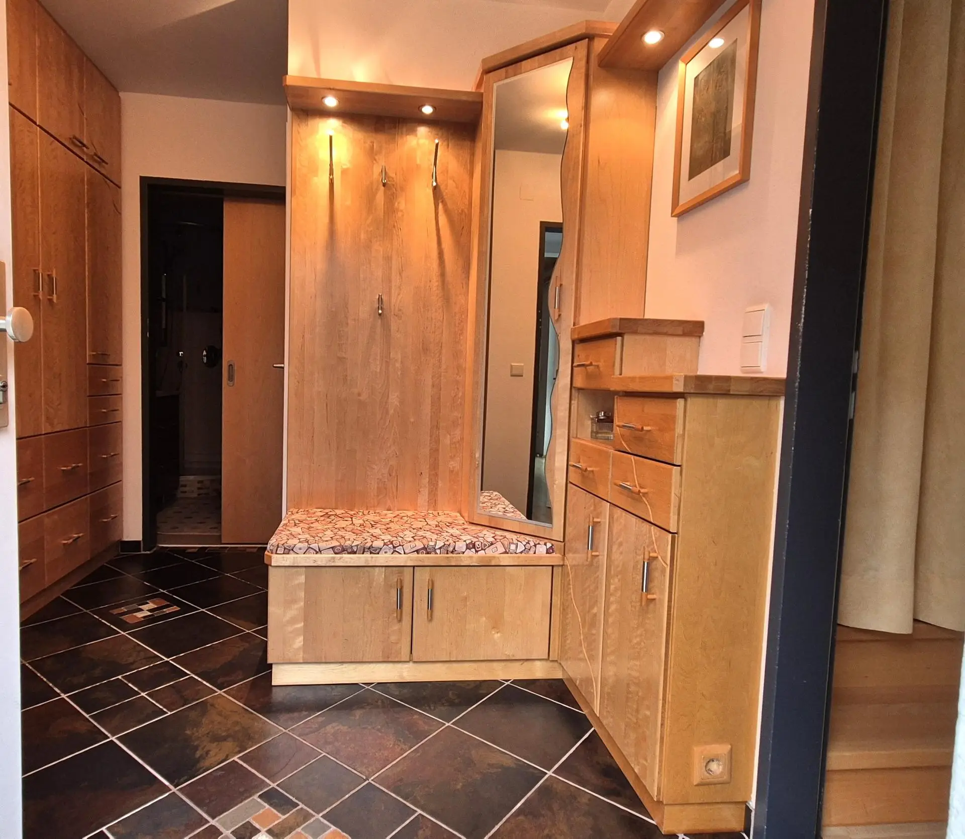 Vom Vorraum führt eine Holztreppe in die obere Wohnebene.
