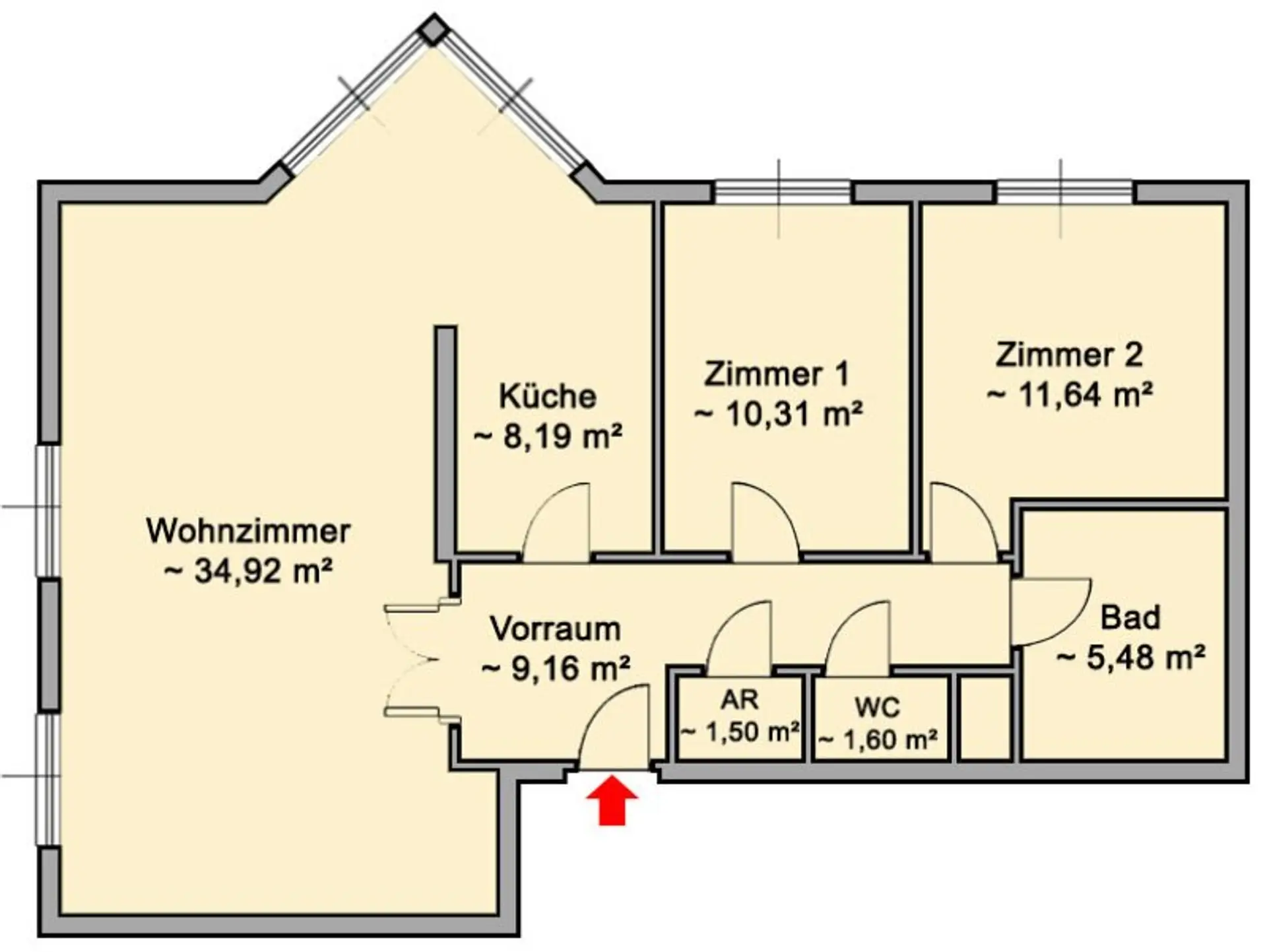 Die Wohnung unterteilt sich in einen zentralen Vorraum, Wohnzimmer und Küche, zwei weitere Zimmer, Bad, ein separates WC und in einen Abstellraum. Wohnzimmer und Küche sind über einen Erker, der durch zwei Fenster besonders hell und freundlich ist, verbunden, die DAN Küche verfügt über eine Bar mit zwei Hockern und ist weiters mit E-Herd (Backofen, Ceranfeld), Dunstabzug, Geschirrspüler und Kühl-Gefrier-Kombination ausgestattet. Das Badezimmer ist eingerichtet mit Wanne, Dusche, beleuchtetem Spiegelschrank, Handtuchheizkörper und hat auch einen Waschmaschinenanschluss.