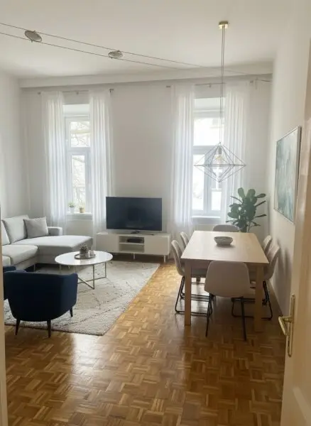 Neue, doppeltverglaste Fenster sorgen für ein angenehmes Raumklima, dies in Kombination mit klassischen Altbau-Elementen wie große Raumhöhe und Holzparkettboden im Wohnzimmer bilden den Ausgangspunkt für ihr individuelles Zuhause. Hier sind ihrer Kreativität keine Grenzen gesetzt.