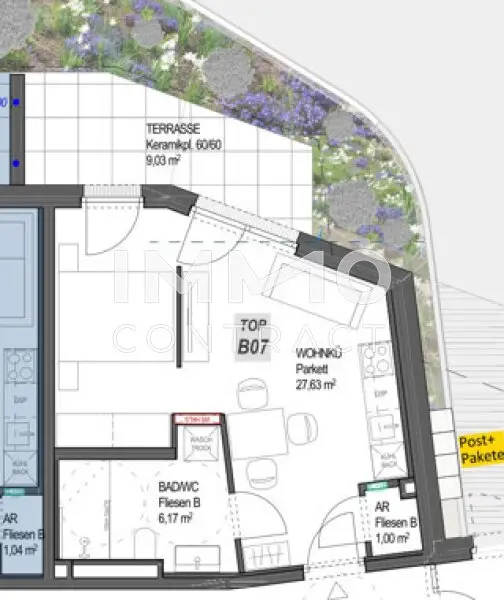 Raumaufteilung: Abstellraum, Bad/WC, Wohnküche (Küche nicht möbliert) mit abgetrennten Schlafbereich, Terrasse/Loggia.