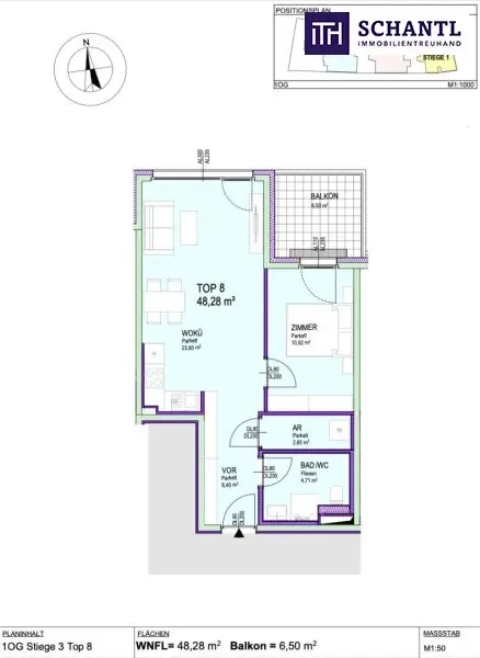 Wohnfläche: ca. 48,28 m² + Balkon: ca. 6,50 m² + Kellerabteil