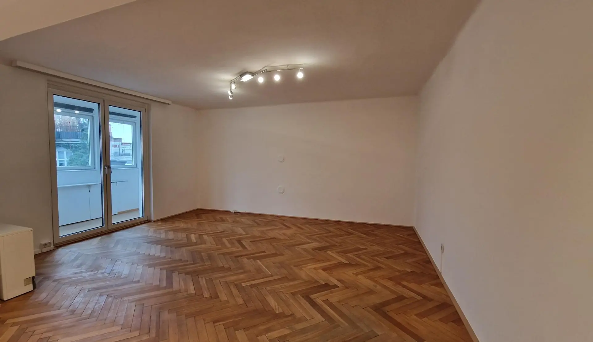 Der zentrale Wohn- und Schlafbereich überzeugt durch seine angenehme Größe und den direkten Zugang zur Loggia, die einen entspannten Ausblick ins Grüne bietet.