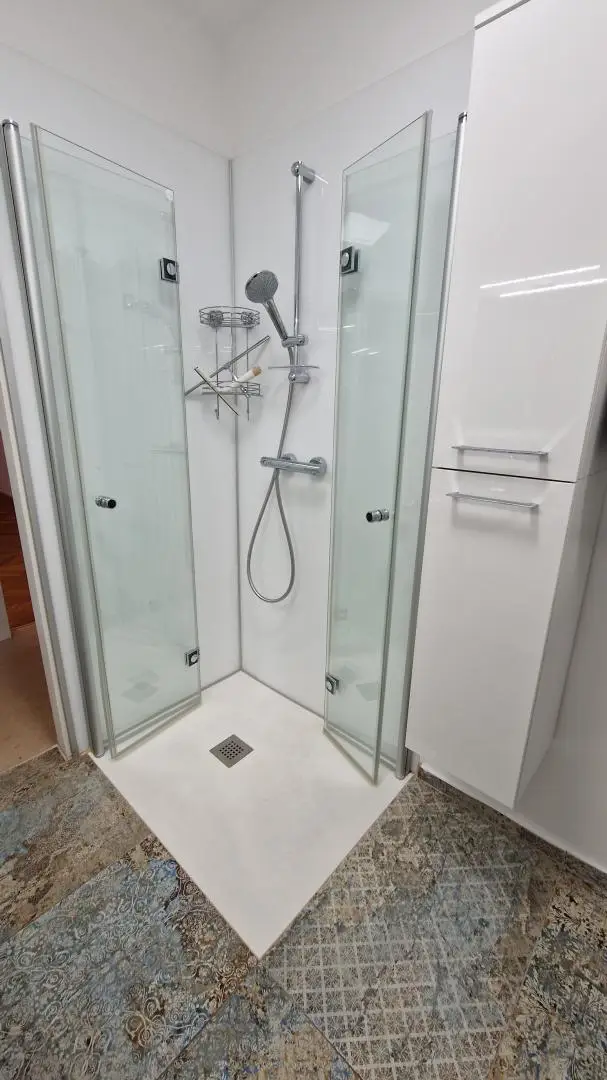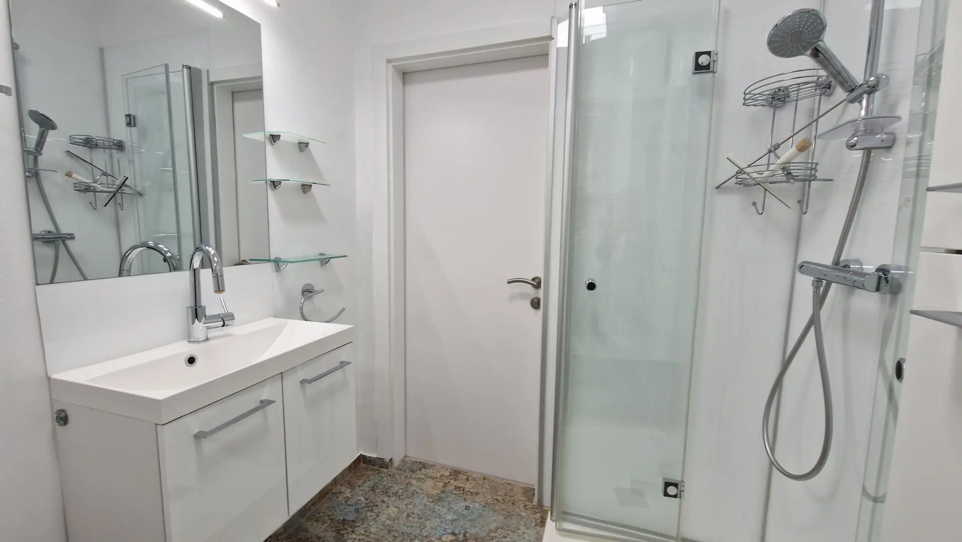 Das stilvoll renovierte Badezimmer ist modern gestaltet und verfügt über eine Dusche sowie eine integrierte Toilette.