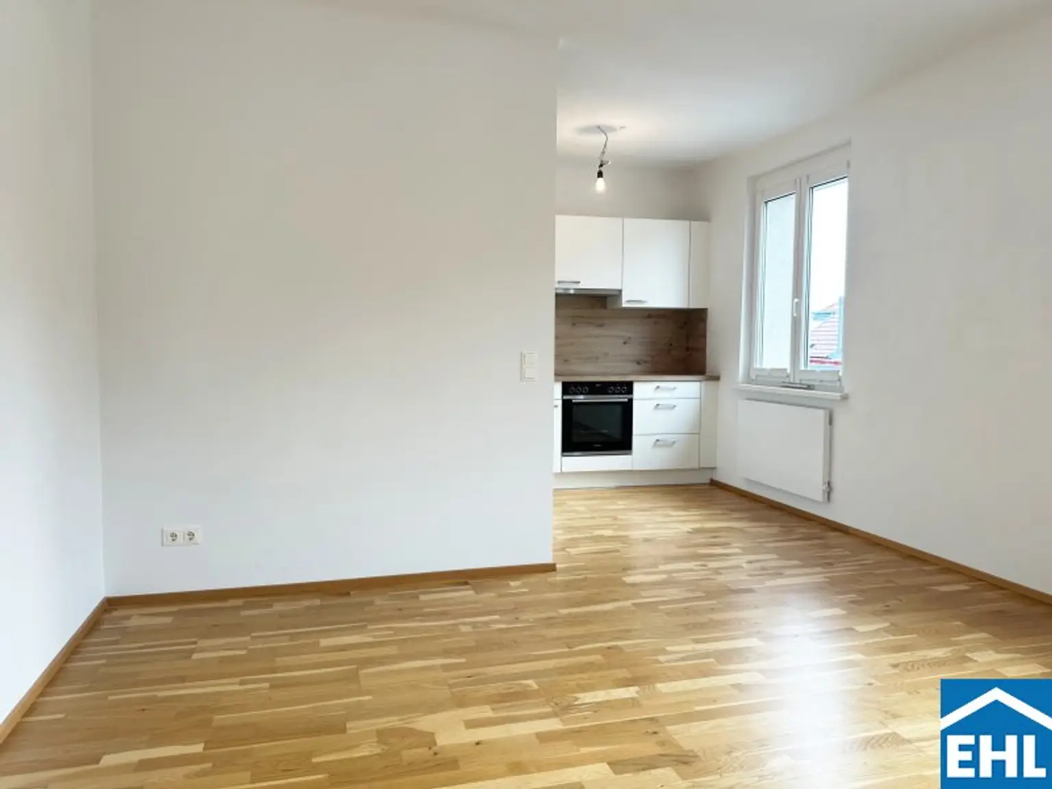 In dem offen gestalteten Wohnbereich findet sich eine bereits ausgestattete, großzügige Küche. Zusätzlich verfügt die Wohnung über innenliegenden Sonnenschutz sowie eine geräumige Garderobe im Schlafzimmer, die für ausreichend Stauraum sorgt.