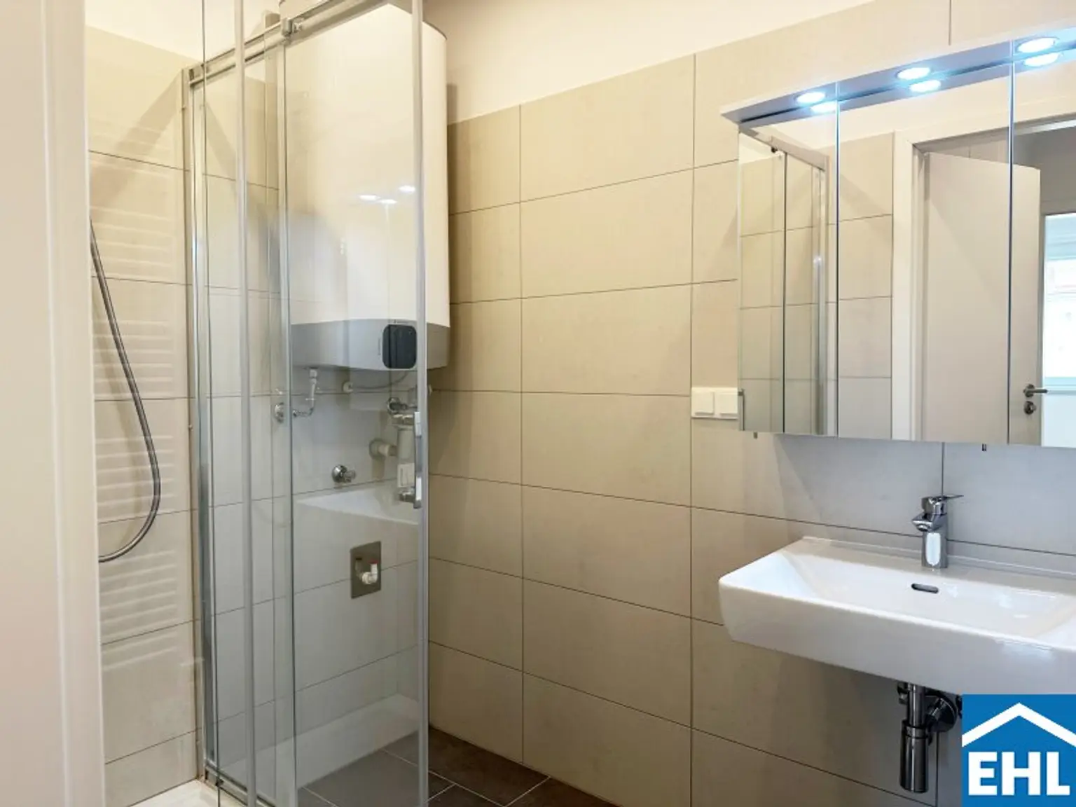 Das Badezimmer ist mit einer Dusche, einem Handtuchheizkörper sowie einem Waschmaschinenanschluss ausgestattet. Für wohlige Wärme sorgen Infrarot-Hybrid-Heizkörper sowie ein Warmwasserspeicher.
