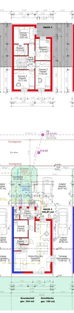 Grundstück und Außenbereich: Jedes Haus verfügt über eine Grundfläche zwischen 342 und 438 m², was Ihnen einen eigenen Garten von 154 bis 319 m² bietet. Zwei Stellplätze, ein gedeckter und ein freier, stehen Ihnen zur Verfügung.